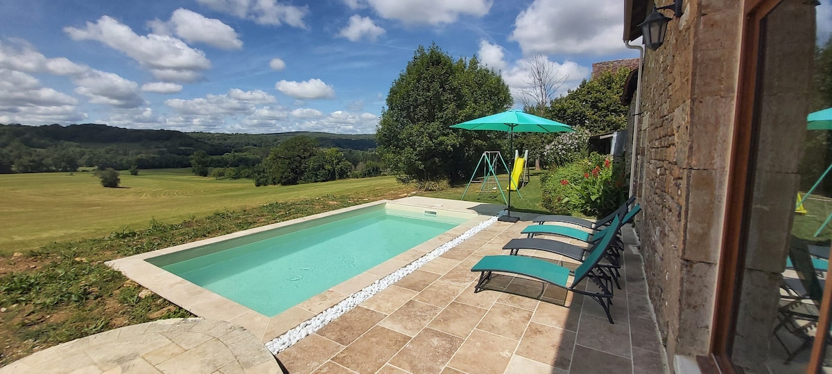 Komm für Herbst/Winter 2025/6 mit 30 % Ermäßigung!! (Bereits angewendet) Ein charmantes Bauernhaus auf 10 Hektar Land, in beneidenswerter Lage mit außergewöhnlichem Blick. Zu jeder Jahreszeit genossen zu werden. Suche im Frühling nach Orchideen; faulenzen im Sommer am (Gemeinschafts-) Infinity-Pool; genieße im Herbst gebratenes Fleisch und Kastanien im Kamin oder gemütlich neben dem Weihnachtsbaum mit der Familie im Winter. Saint Robert, eines der „Les Plus Beaux Villages des France“, ist nur wenige Minuten oder 20 Gehminuten entfernt.