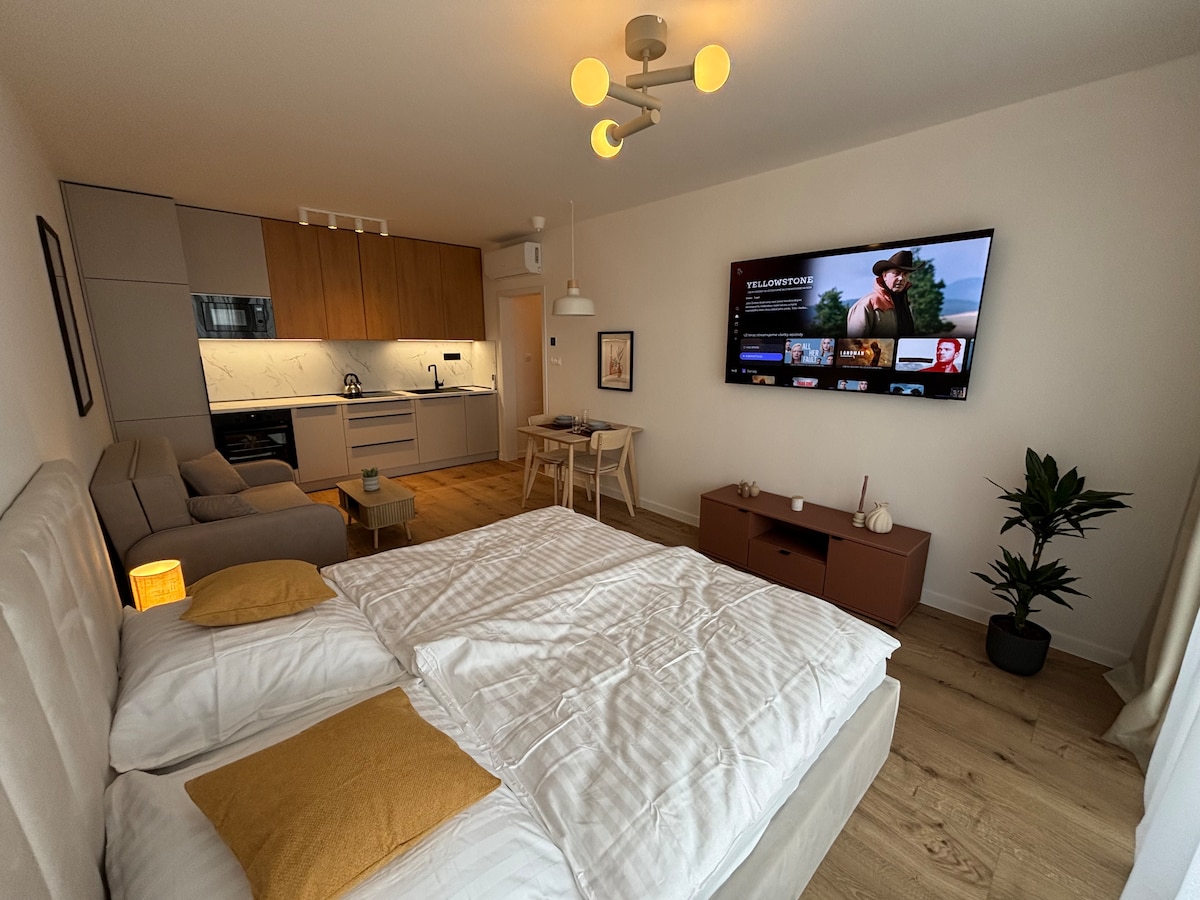 Krásny apartmán Muška ponúka elegantné a útulné ubytovanie s priestrannou lodžiou, ideálnou na rannú kávu či večerné chvíle pokoja. Je vhodný pre jednotlivcov, páry, páry s 2deťmi, ktorí hľadajú pohodlie, oddych, súkromie a príjemnú atmosféru s nádychom luxusu a romantiky pre každého. Nachádza sa v tichej lokalite s výbornou dostupnosťou, iba 2km do centra mesta. 300 metrov od apartmánu sa nachádza obchodný dom Billa a kúsok ďalej príjemná reštaurácia s bowlingom.