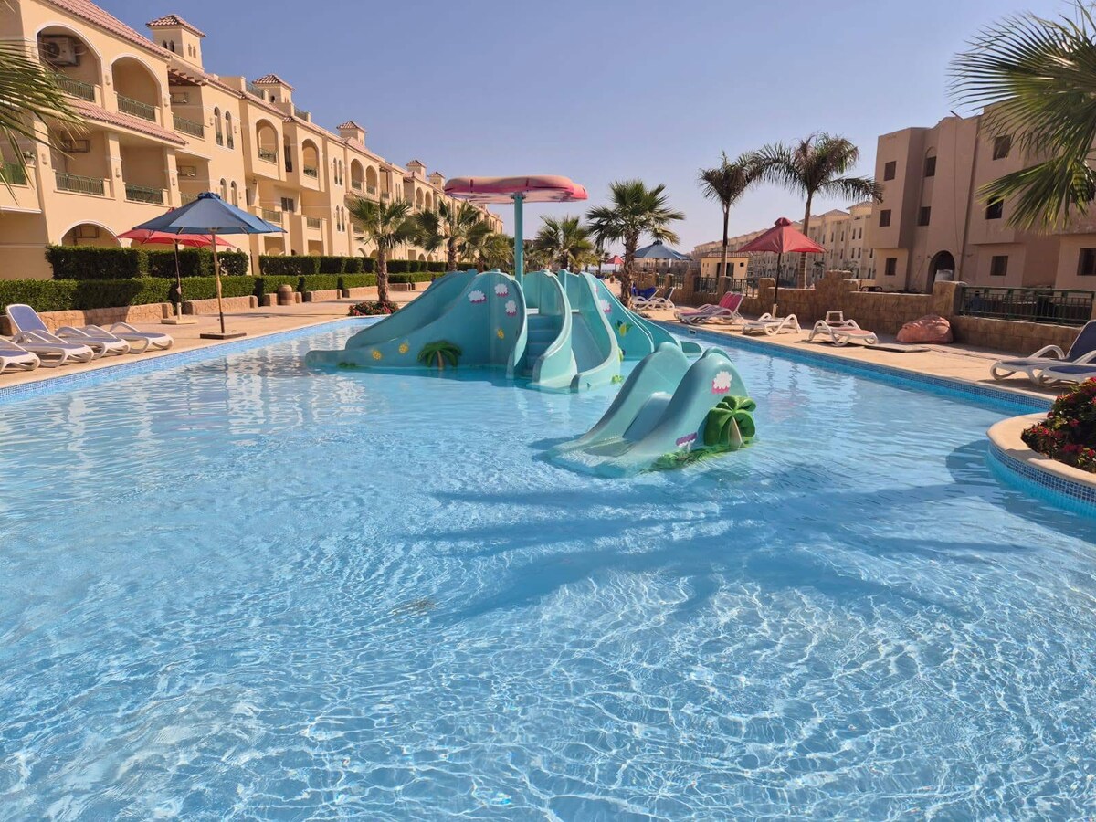 Moderne 2-Zimmer-Wohnung im Elite Tulip Hotel, Ain Sokhna. Voll ausgestattet mit Küche, WLAN, Klimaanlage und ruhiger Blick auf die Rückseite. Platz für bis zu 4 Gäste. Kostenloser Zugang zum privaten Sandstrand, zu Swimmingpools und zur Hotellobby. Kostenpflichtiger Service: Restaurants, Wäscherei und Fitnessraum. Idealer Ort zum Entspannen am Meer mit dem Komfort von zuhause und den Vorteilen eines Resorts.