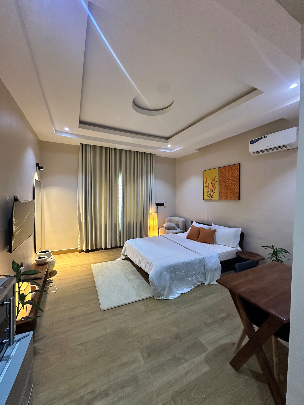 Entspanne dich in dieser ruhigen, Designer-Wohnung mit 1 Schlafzimmer in Jahi, Abuja. Mit warmen, erdigen Tönen, einer gemütlichen Lounge, einem privaten Balkon und einer voll ausgestatteten Küche ist es perfekt für Paare, Alleinreisende und Remote-Mitarbeiter. Genieße schnelles WLAN, stilvolle Innenräume und eine ruhige Atmosphäre, nur wenige Minuten vom Stadttrubel entfernt. Dein modernes zweites Zuhause.