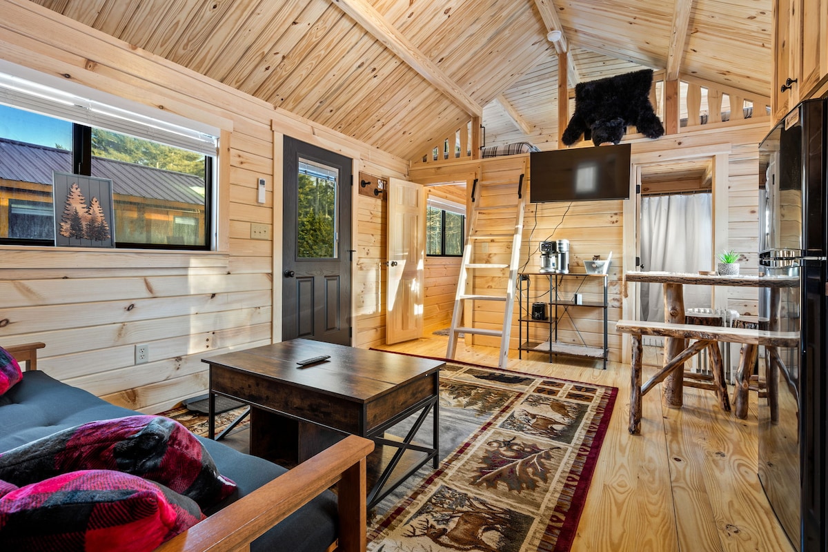 Wache in diesem romantischen Tiny House am Wasser in Norway, Maine, mit dem Rauschen von Wasserfällen direkt vor deiner Glaswand auf! Privater Whirlpool mit Blick auf den Fluss, durchsichtiger Gaskamin, gemütliches, erhöhtes Queensize-Bett mit Blick auf das Wasser, Außendusche, Hängematten und direkter Zugang zu Wanderwegen. Absolute Privatsphäre – keine Nachbarn in Sichtweite. Moderne Küche, Fußbodenheizung, schnelles WLAN und durchdachte Details für Paare oder Alleinreisende. Romantischer Kurzurlaub in der Nähe des Sunday River: Skifahren, Golf und Abenteuer in Maine. Eine Oase der Natur