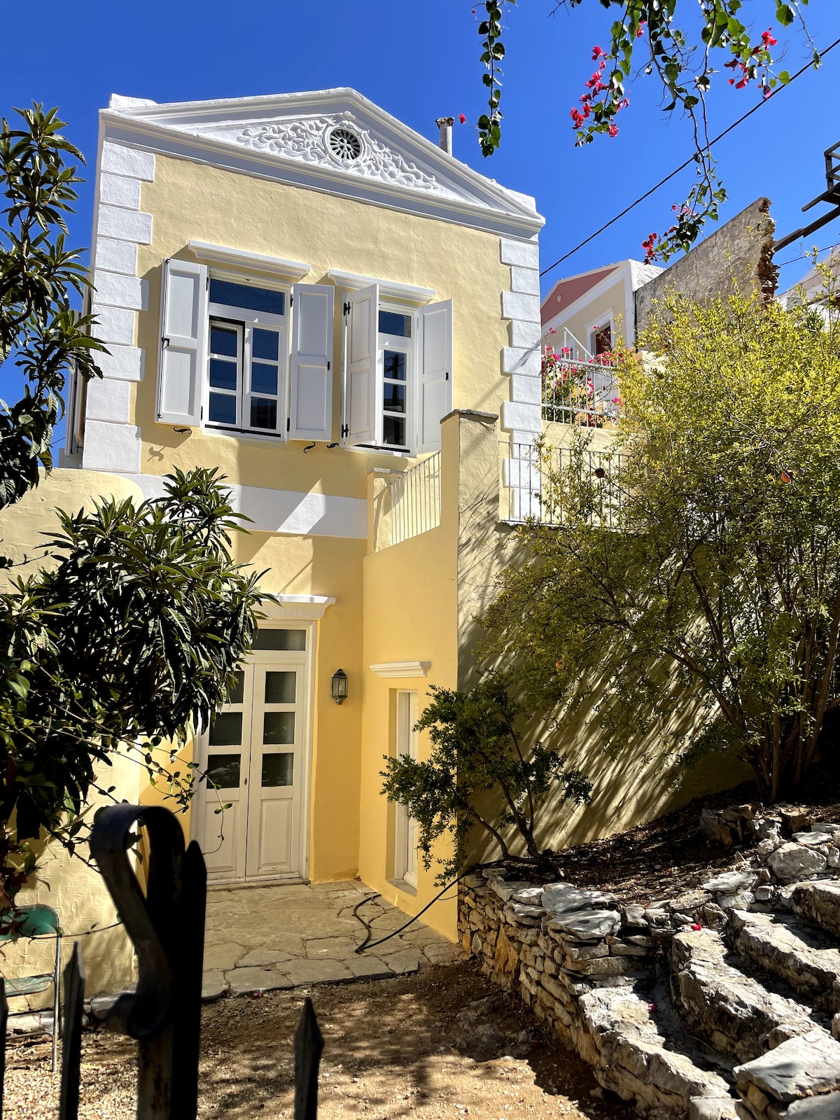 Dieses restaurierte Anwesen befindet sich auf einem kleinen Platz und eine der wichtigsten Straßen von Chorion, die die Kirche Agios Athanassios mit dem Viertel Lieni verbindet. Das Haus pflegt seinen ursprünglichen Kopfsteinpflasterboden und ist in gelben Ocker- und Karmin-Tönen gestrichen. Während der Restaurierung wurden alle ursprünglichen dekorativen Merkmale sorgfältig erhalten. Das Haus verfügt über eine Terrasse mit atemberaubendem 360-Grad-Blick auf Symi, einen Balkon, einen alten gewölbten Backofen, eine unterirdische Zisterne und einen gewölbten Keller.