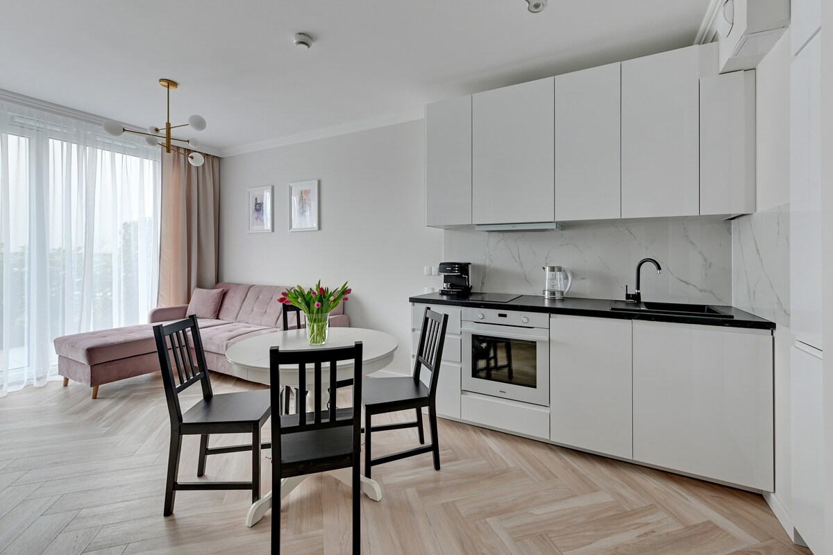 Moderne und einladende Unterkunft für bis zu vier Gäste. Mit einem offenen Layout verbindet das Studio nahtlos das Schlafzimmer, den Wohnbereich und die Küchenzeile. Genieße die Dachterrasse, den Fitnessraum, den Coworking-Space und das Kinderspielzimmer im Gebäude. Zu Fuß erreichbar: Altstadt 10 Minuten, Museum des Zweiten Weltkriegs 5 Minuten, St. Marienkirche, Amber Sky Riesenrad und die Gdanski-Werft sind nur einen Spaziergang entfernt! Wähle die richtige Unterkunft in Danzig!