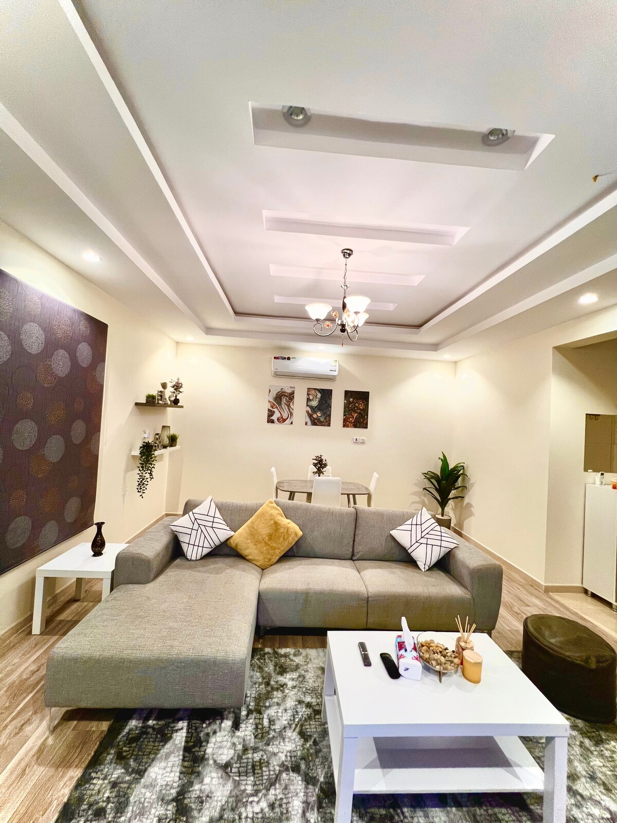 „Modern Home“ ist ein Haus, das für große Familien geeignet ist Diese große Unterkunft bietet ( vier Betten ) und ist ausreichend für 6 Personen . * Die Unterkunft verfügt über "zwei Schlafzimmer, zwei Badezimmer" sowie eine voll ausgestattete Küche, einen Esstisch, eine Waschmaschine und einen Smart-TV, um die besten Filme und Spiele auf Netflix und Shahid anzusehen. Ein kostenloser Gepäcktransport sowie kostenlose Parkplätze hinter dem Gebäude stehen zur Verfügung. Wir bieten eine amerikanische Kaffeemaschine und einen Wasserkocher für Tee. ^ (Wir bieten Self-Check-in) ^