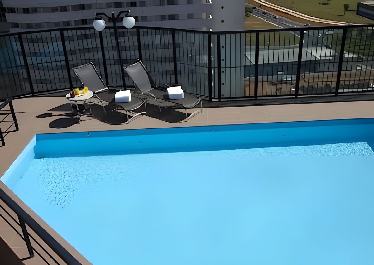 Nimm die ganze Familie mit in eine clubähnliche Eigentumswohnung mit viel Platz für Spaß in den beheizten, überdachten Pools und dem Strandpool. Wir haben einen überdachten Garagenplatz. Wohnung mit 2 Schlafzimmern, eines davon mit eigenem Bad und Klimaanlage, und einem weiteren Gemeinschaftsbad. Es gibt zwei Doppelbetten und ein Wohnzimmer mit einem Ausziehbett und Verdunkelungsvorhängen. Sie können ihre Taschen abstellen und im Warteraum warten oder den Gemeinschaftsbereich vor dem Check-in nutzen. Nachbarschaft: Águas Claras, eine sichere neue Stadt mit vielen Restaurantoptionen