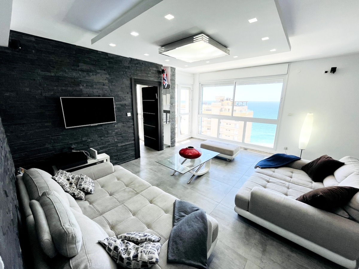 Die Wohnung befindet sich in einer ruhigen Straße Nur eine Gehminute vom Unabhängigkeitsplatz entfernt, offener Meerblick von jedem Fenster Man kann die Wellen hören, ein wunderbares Gefühl In der Nähe aller Sehenswürdigkeiten, 1 Gehminute vom Hauptplatz, ein paar Minuten vom Strand, 1 Gehminute von allen Meeresattraktionen entfernt In dieser Gegend gibt es viele Restaurants In der Nähe befinden sich Synagogen Große und koschere Küche Mehadrin Es gibt einen verwöhnenden Doppel-Whirlpool mit Meerblick. Es gibt ein Dampfbad Essbereich Tisch für bis zu 16 Personen Es gibt eine Ecke mit Sofas in Richtung Meer Der Meerblick spiegelt sich von jedem Fenster wider Es gibt Aquarien mit schönen Fischen Es gibt ein Dampfbad Perfekte und luxuriöse Wohnung für einen perfekten Urlaub Sieh und hör und atme das Meer