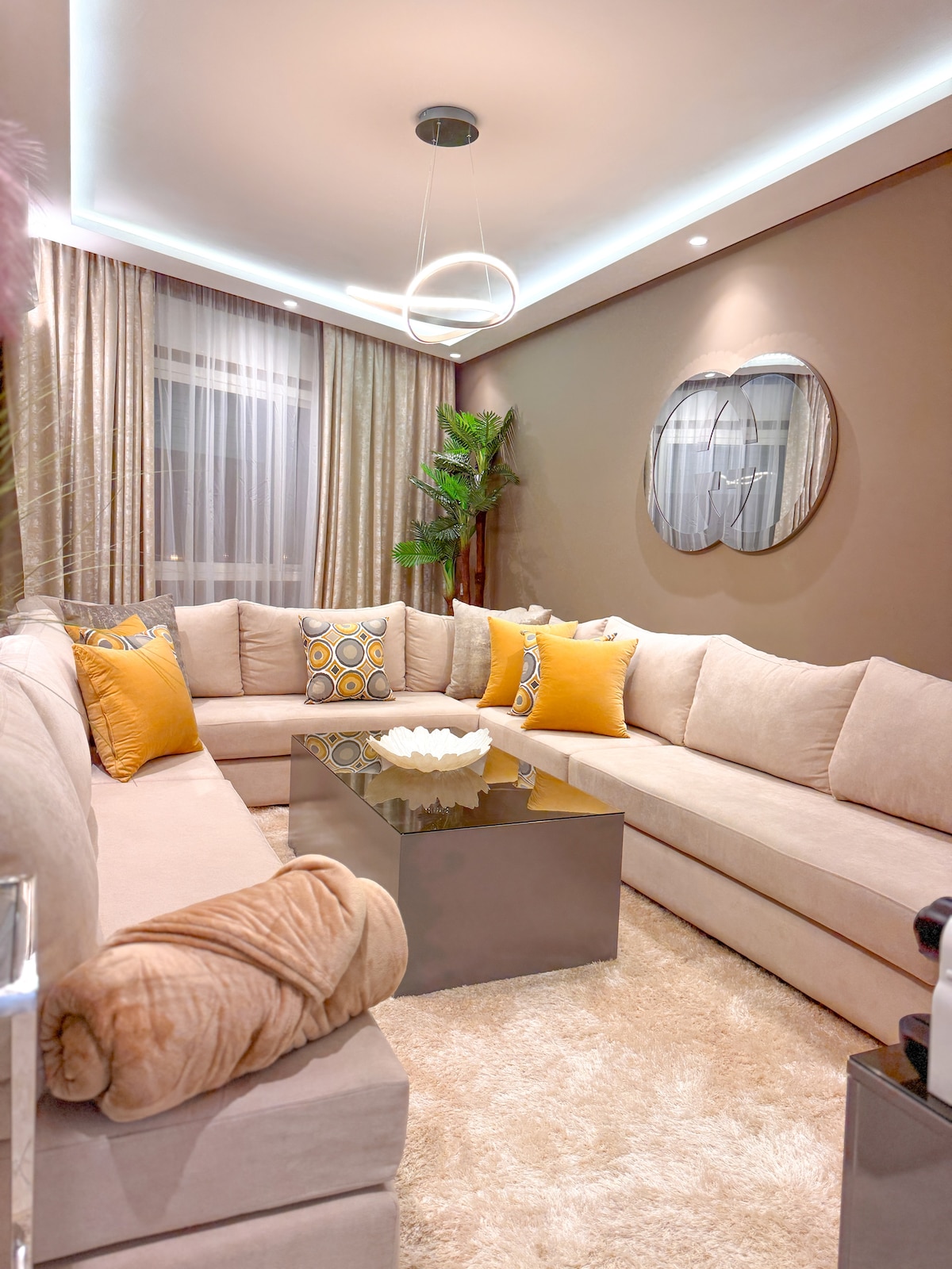 Willkommen in unserer brandneuen Wohnung mit zwei Schlafzimmern in einer erstklassigen Gegend von Tanger. Diese gehobene Unterkunft befindet sich in einer der begehrtesten Gegenden der Stadt mit 24-Stunden-Concierge und ist nur 10 Gehminuten vom Bahnhof, der City Centre Mall, der Ibn Battuta Mall und den Stränden entfernt. Es bietet sowohl Komfort als auch Luxus vor der Haustüre. Privatparkplatz vorhanden. Das Apartment verfügt über: Glasfaser-WLAN, eine Option für einen Chauffeur und ein marokkanisches Frühstück, das von unserer Gouvernante zubereitet wird (zusätzliche Kosten)