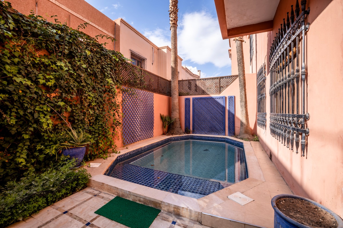 Entdecken Sie Villa Majorelle, eine komplett privatisierte marokkanische Villa im Zentrum von Marrakesch, 10 Minuten von Guéliz entfernt. Die Villa bietet 4 geräumige Suiten mit eigenem Bad, einen großen Pool im Herzen des Gartens, eine ausgestattete Dachterrasse und große Wohnräume. Ideal für Familien oder Gruppen bis zu 8 Personen, die Marrakesch entdecken möchten und gleichzeitig eine elegante und komfortable Villa genießen möchten.