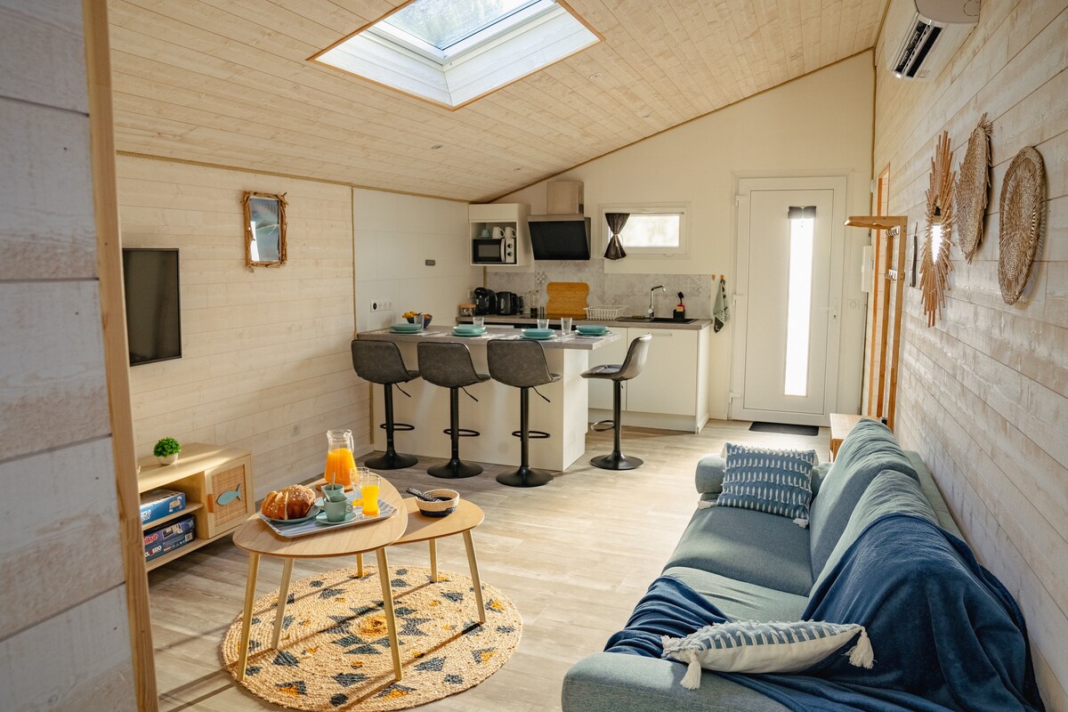 BIEN LIRE pour BIEN CHOISIR ! La casita :T1 bis simple, claire et ressourçant avec l'énergie du bois associée aux couleurs terre, la vieille planche de surf de famille en prime ! 20 m2 : salon avec canapé lit/kitchnette +1 chambre et 1 SDB baignoire 140 cm. Espace extérieur. Table et 2 chaises. Cadre paisible avec lac à 50 mètres à pied, et océan à 10 /12 minutes à vélo /5 minutes en voiture. Emplacement entre Bayonne et Hossegor. (Ni en ville, ni sur l’océan ) Idéal à 2, appoint pour +