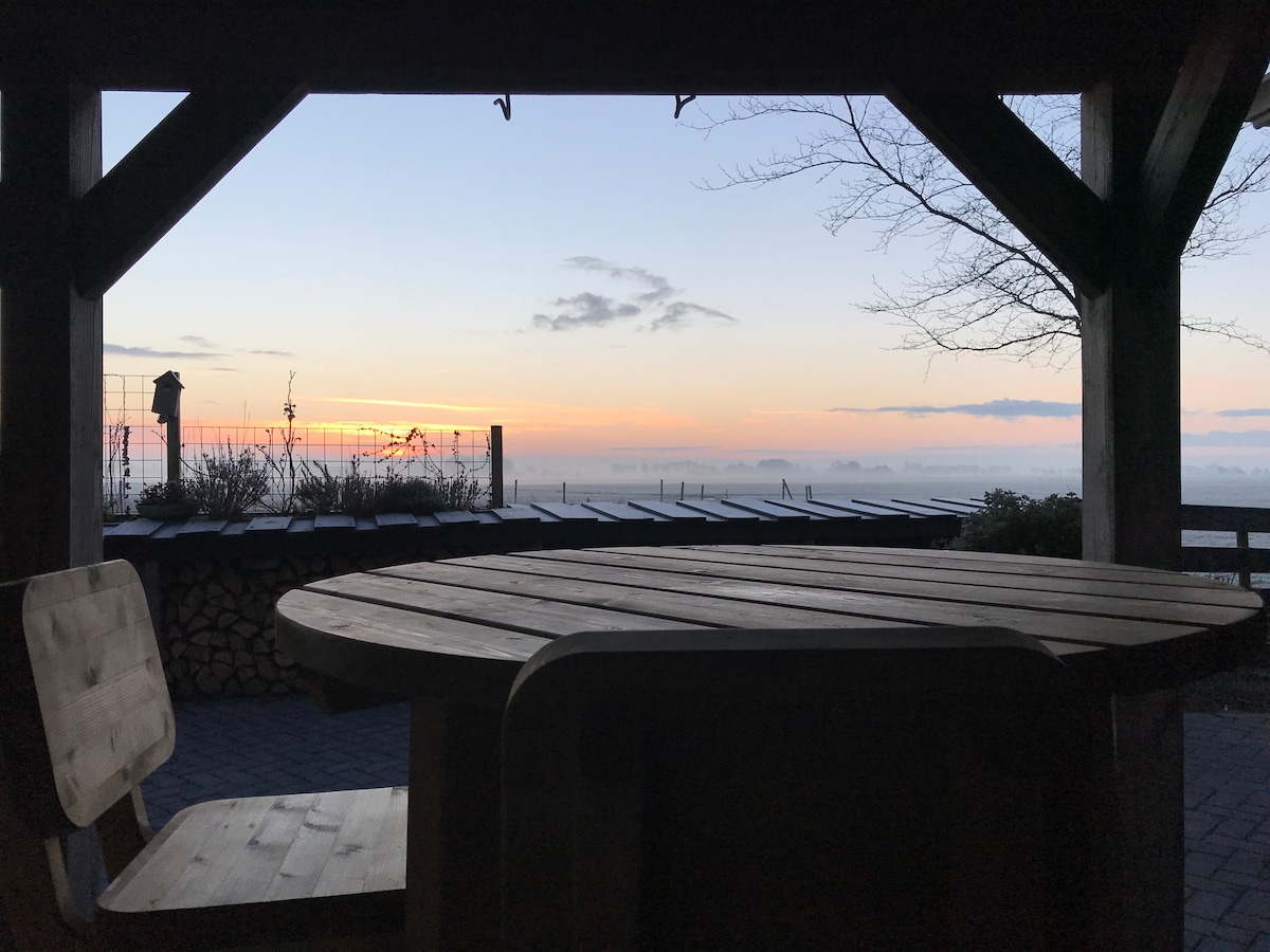 Schöne Wohnung in einzigartiger und ruhiger Lage mit Blick auf die friesische Landschaft. Die Wohnung hat ein eigenes Wohnzimmer, Schlafzimmer, Küche, Badezimmer (Dusche, Badewanne, Waschbecken und Toilette) und eigenes Eingang. Sie können auch drauβen auf der Terrasse oder im Garten sitzen.
