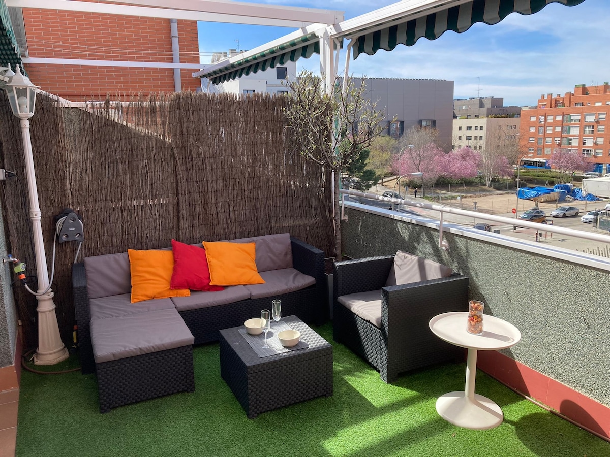 Ático luminoso con gran terraza privada en barrio tranquilo, junto a parque y polideportivo con piscina. Ideal para familias, parejas o profesionales. A solo 5 min del metro y de la universidad IE (Caleido). Wifi, A/A y cocina equipada incluidos