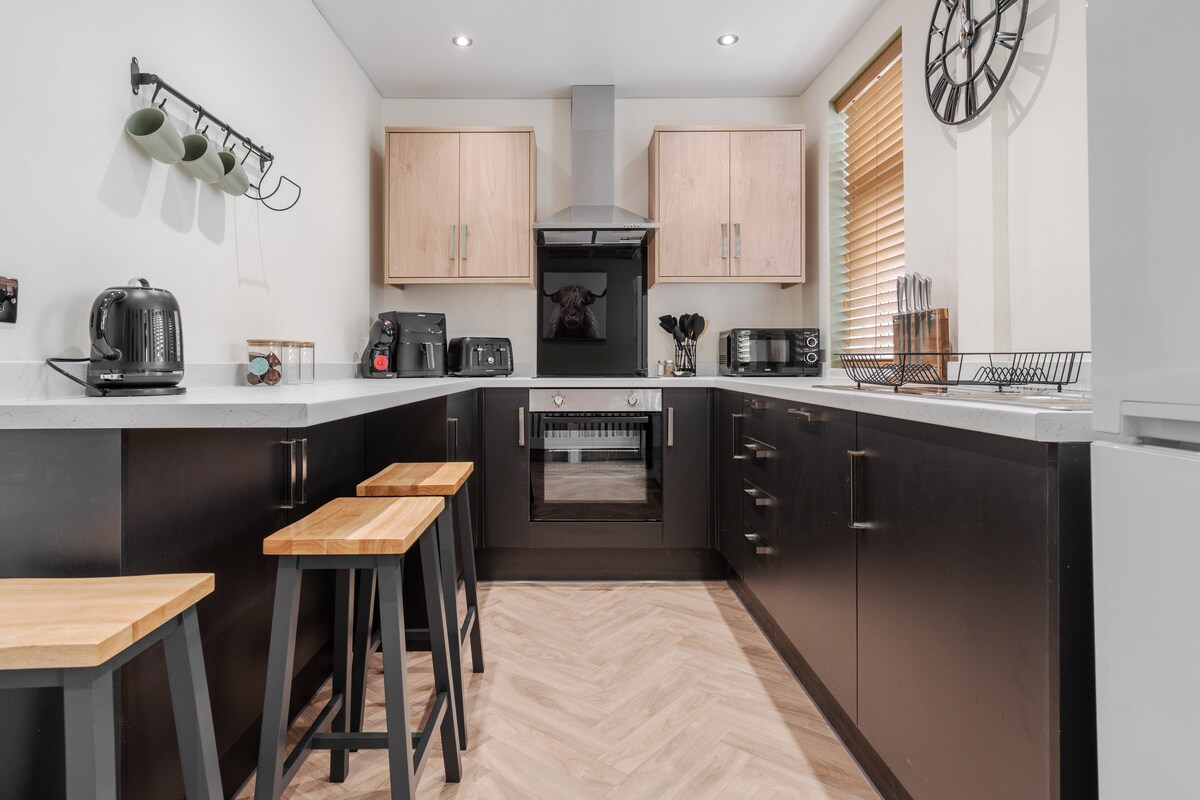 Modernes, freistehendes Haus mit 3 Schlafzimmern, offener Küche und geräumigem Wohnzimmer im ersten Stock mit Balkon.
