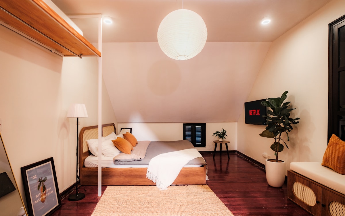 - Das Loft mit zuverlässigem WLAN befindet sich in einem malerischen Altbau, der mit üppig grünen Reben bedeckt ist und dem Westlake zugewandt ist. - Nur eine 30-minütige Fahrt vom Flughafen und eine 10-minütige Fahrt vom Altstadtviertel entfernt - Die Gegend verfügt über eine lebendige Expat-Community und zahlreiche Cafés, Restaurants und Salons, die einen lebendigen und dennoch ruhigen Rückzugsort auf einer Halbinsel bieten, die von Westlake mit minimalem Verkehr umgeben ist - Möbel aus Altholz in unserer Werkstatt fördern ökologische Nachhaltigkeit und lokale Handwerkskunst.