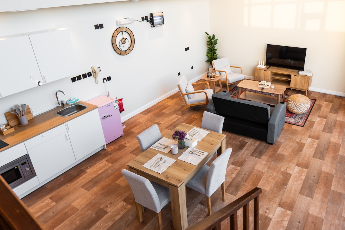 Newly furnished beach-themed apartment overlooking the ocean in the heart of KAEC city. We are right above the beachfront walk with lots of activities and restaurants nearby. Our location is a prime spot and you are bound to have a good time!
