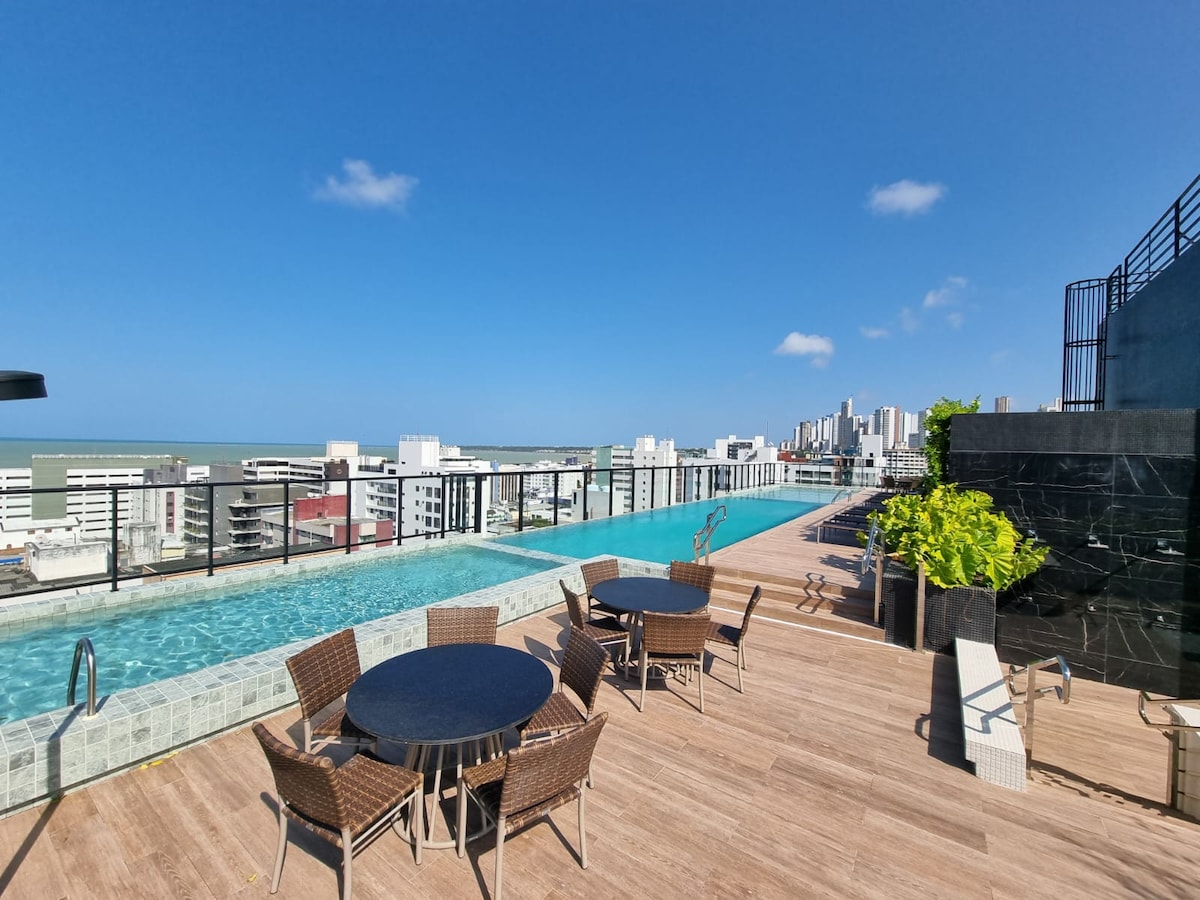 Genieße eine Wohnung mit seitlichem Meerblick, die sich vor dem Strand von Cabo Branco befindet, in der Nähe von Restaurants und Bars. Perfekt für alle, die Komfort, Zweckmäßigkeit und Freizeit an einem Ort suchen. Setai Yacht 325 hat ein modernes Design und bietet einen Pool auf der Dachterrasse mit Meerblick, einen ausgestatteten Fitnessraum, eine Sauna, Coworking, Annehmlichkeiten, eine Gemeinschaftswäscherei und vieles mehr. Die Allee ist perfekt zum Wandern und Radfahren. Fahrräder stehen gegen eine kleine Gebühr zur Verfügung.
