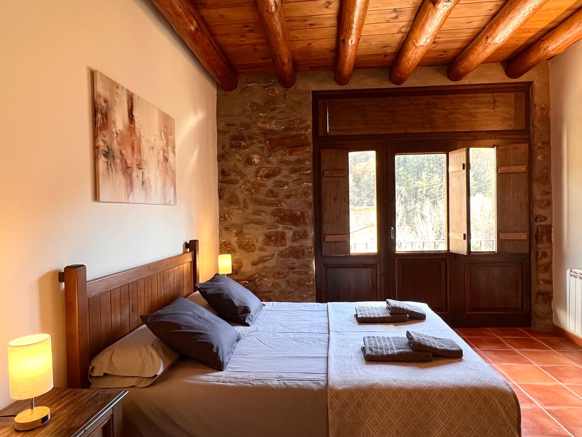 El granero dispone de un salón comedor con cocina negra, una habitación con cama doble, altillo con dos camas y sofá cama en el salón. También tiene doble ducha con ventana para poder admirar la naturaleza mientras te duchas. Chimenea, piscina y rio. Y un entorno con un conjunto monumental formado por una iglesia románica con cripta, un cementerio modernista y poblado íber a 5min. Espectacular! A 5 min un restaurante rural y a 10 min el pueblo/ciudad.