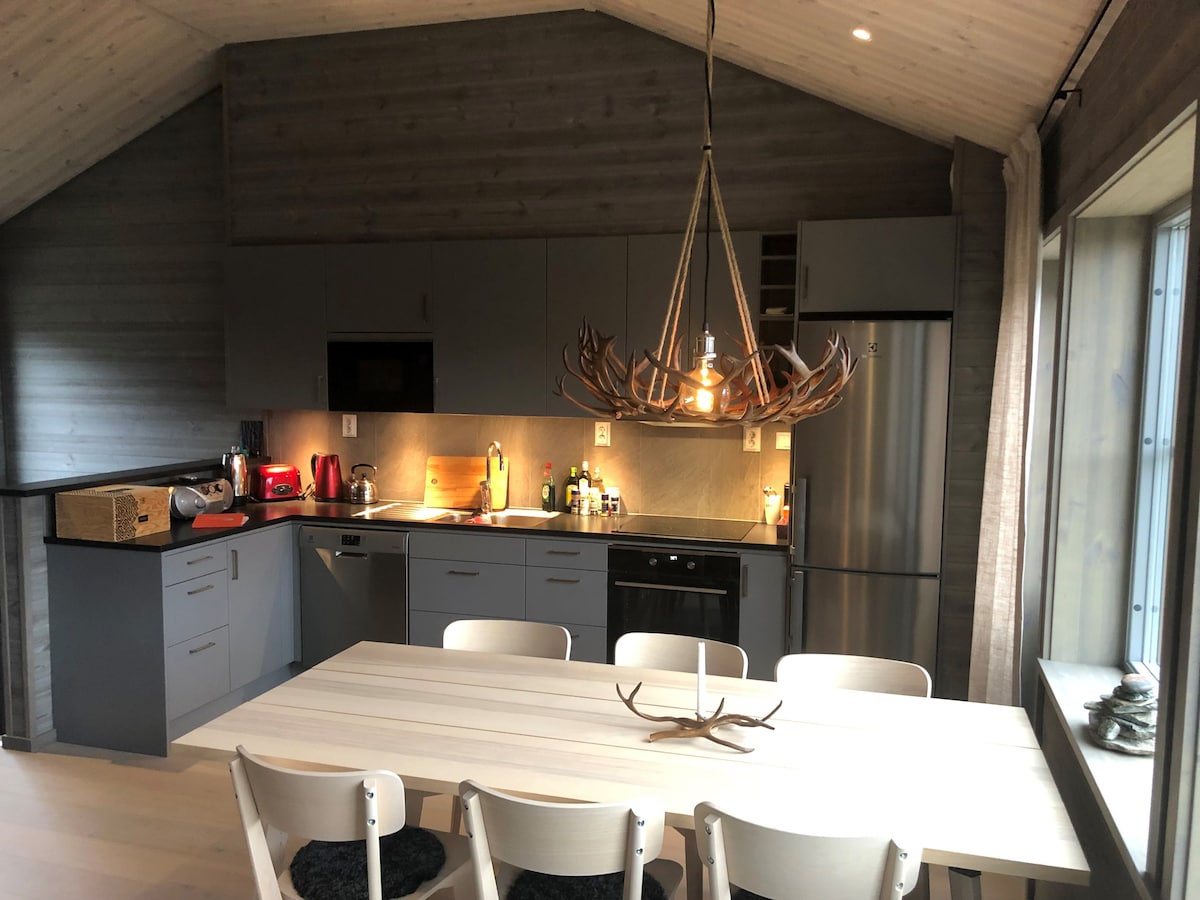 Wachen Sie mit einer spektakulären Aussicht auf und genießen Sie Ihren Morgenkaffee, während Sie die frische Luft einatmen und Ihren Blick auf die herrliche Natur ruhen lassen. Unser Ferienhaus bietet genau das. Unser Ferienhaus ist mit allen modernen Annehmlichkeiten ausgestattet, die Sie sich vorstellen können. Der offene Grundriss des Ferienhauses schafft eine helle und geräumige Atmosphäre, in der die moderne Küche, das Wohnzimmer und der Essbereich elegant verschmelzen. Die großen Fenster lassen die Natur herein und bieten einen unschlagbaren Blick auf das Tal.