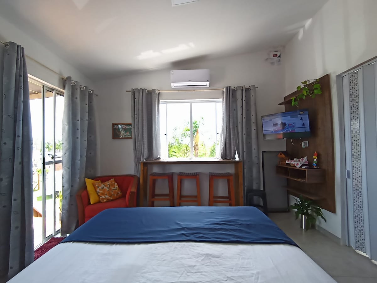 Kitnet am Strand von Cal, in der Nähe der wichtigsten Sehenswürdigkeiten der Stadt. Platz für bis zu 3 Personen. • Integriertes Schlafzimmer und Küche • Privates Badezimmer • 24-Zoll-Fernseher mit freigeschaltetem Netflix und Max • Ventilator • Küchenutensilien • Waschtrog und Wäscheleine im Außenbereich Der Hof wird geteilt.