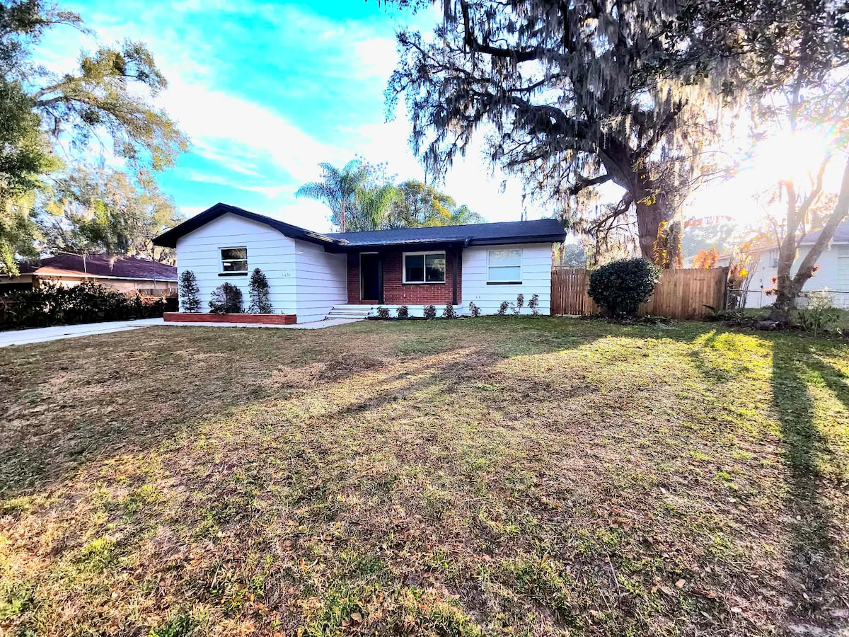 Übernachte in einem charmanten, haustierfreundlichen historischen Haus aus den 1920er Jahren in Dade City mit einem komplett eingezäunten Garten, einer Veranda und einer Feuerstelle – durchdacht mit modernem Komfort aktualisiert. Die Highlights: • 2 Schlafzimmer: 1 Kingsize-Bett, 1 Queensize-Bett + Luftmatratze • Veranda-Schaukel — perfekt für morgens Kaffee oder abends Entspannung • Terrasse mit Grill für Mahlzeiten im Freien • Feuerstelle mit Stühlen für gemütliche Abende • Cornhole-Spiel für zusätzlichen Spaß • Nur 10 Minuten vom Stadtzentrum von Dade City entfernt • 15 Minuten von der Saint Leo University entfernt