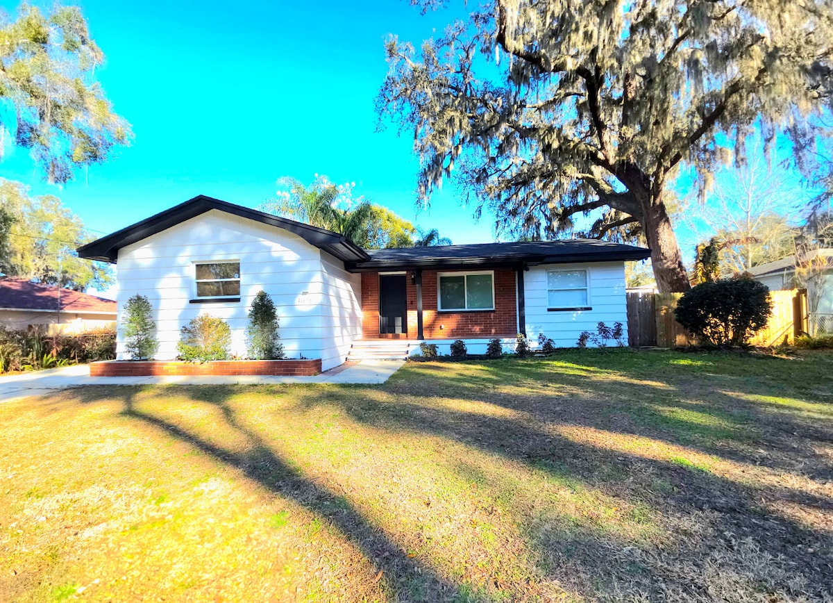Stay in a charming pet friendly 1920s historic home in Dade City featuring a fully fenced yard, front porch swing, and firepit.— thoughtfully updated with modern comfort. Highlights: • 2 bedrooms: 1 king bed, 1 queen bed + air mattress • Front porch swing — perfect for morning coffee or evening relaxation • Deck with grill for outdoor dining • Firepit with chairs for cozy nights • Cornhole game for added fun • Just 10 minutes from downtown Dade City • 15 minutes from Saint Leo University