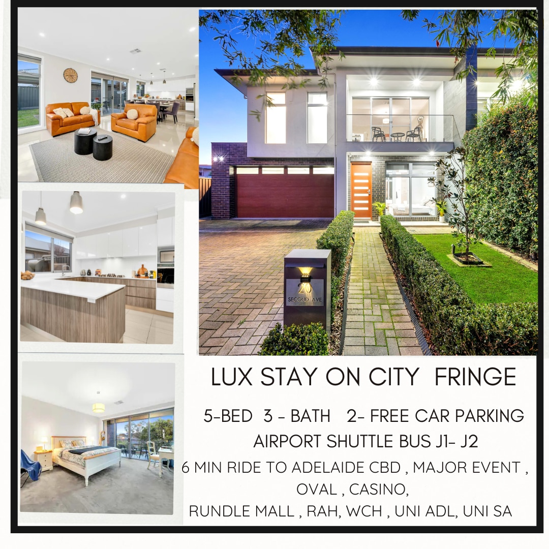 Luxuriöser Rückzugsort, perfekt für Familien und Gruppen ✪ 5 Schlafzimmer -3 Badezimmer -4 kostenloser Parkplatz ✪ Platz für 11+ 1 Baby ✪ 6 Minuten zum CBD (Fahrt)/9 Minuten Fahrt ✪ Bettenausstattung: 1 Kingsize-Doppelbett, 2 Queensize-Doppelbett, 2 Etagenbetten , 1 Einzelbett+ Babybett ✪ Voll ausgestattete Küche ✪ Connoisseur 4-Burner-Grill Abendessen im ✪ Freien mit Festonlicht In der Nähe: Adelaide City, Oval, RAH, WCH Sonderangebote ✨ 15 % Rabatt für Aufenthalte über einen Monat ✨ 10 % Rabatt für Aufenthalte über eine Woche ✨ Flexible Buchung Elegante Aufenthalte – Stolz in SA Besitz & Betrieb. Danke!