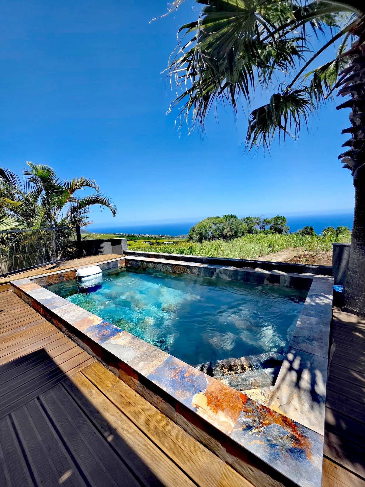 In einem schönen geschlossenen kreolischen Garten von 1000 m2 (Litschis, Longanis, Avocados, Vanille, Mangos, Pitaya, Kokosnuss ...) erwachen Sie mit einem herrlichen Blick auf die Berge in einem brandneuen Bungalow aus einheimischem Holz mit eigenem Eingang und mit Charme eingerichtet. Auch in einem 30°C warmen Natursteinschwimmbad können Sie das ganze Jahr über entspannen und relaxen.