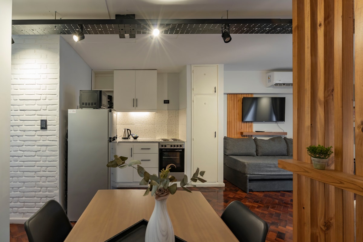 Moderne und gemütliche Wohnung mit Pool, ideal für Ruhe und Genuss. Schlafplätze für 4: ein Schlafzimmer mit eigenem Bad und ein Schlafsofa im Wohnzimmer. WLAN, ausgestattete Küche, Klimaanlage im Schlafzimmer und Wohnzimmer, 1 Badezimmer und Balkon mit schöner Aussicht. Parkplatz, Smart-TV, Flow, elektronisches Schloss, Bettwäsche, Shampoo, Trockner und Bügeleisen. Fitnessraum in der Anlage. Ideale Lage: a metros de Av. Perón, mit Restaurants, Eisdielen und Cafés. Ganz in der Nähe von Wanderwegen zum Wandern und Mountainbiken.