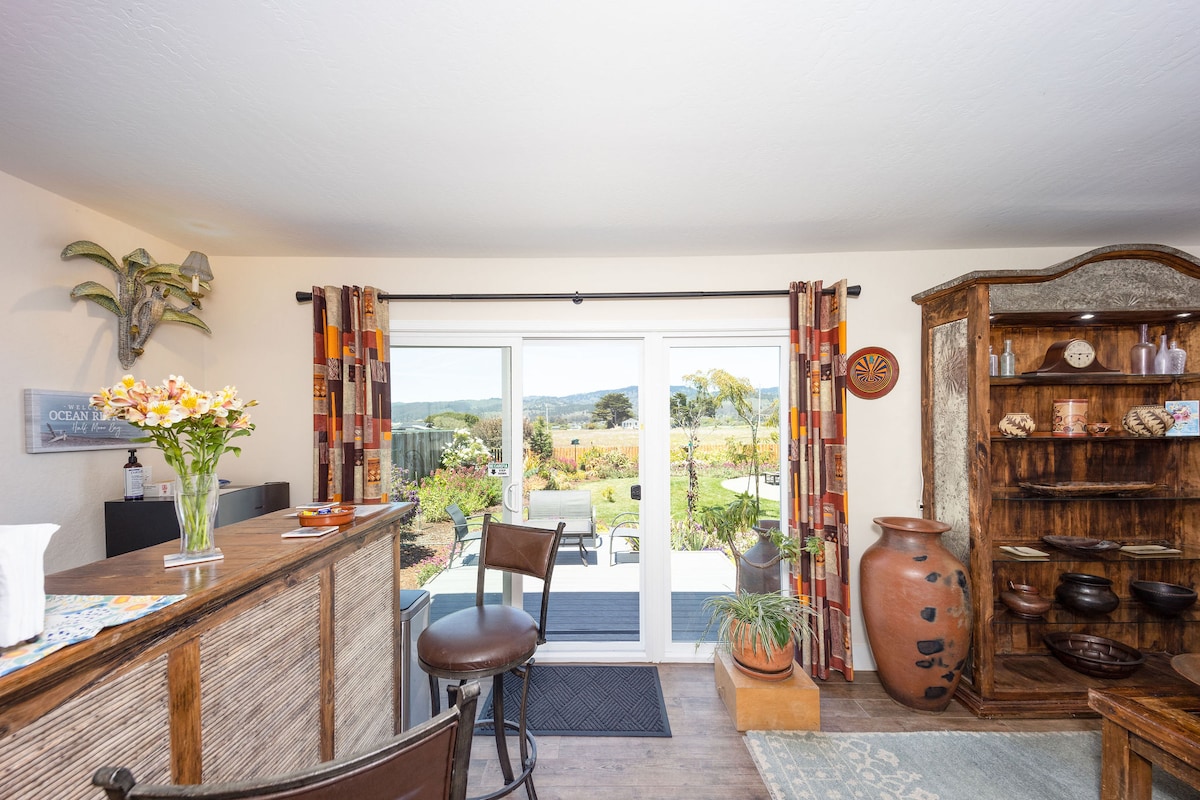 Einatmen. Ausatmen. Entspanne dich in diesem gemütlichen, romantischen Gästehaus, eingebettet in die Redwoods der Santa Cruz Mountains, mit Blick auf die Bucht und günstig in der Nähe des berühmten Alice's Restaurant am Skyline Blvd in Woodside gelegen. Das 1 Hektar große, eingezäunte Grundstück bietet ausreichend Parkplätze und Privatsphäre. Kuscheln Sie sich an den Holzofen, bereiten Sie Mahlzeiten in der großen Küche zu und genießen Sie den Blick auf die majestätischen Redwoods direkt vor den Fenstern mit Blick auf die Bucht, die durch die Bäume schaut.