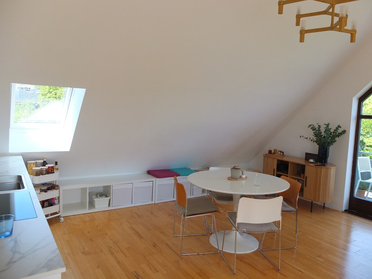 Hübsche Wohnung in Tutzing für erholsame Tage am See und als Ausgangspunkt für Ausflüge in die Berge oder nach München. Das Appartment befindet sich in der Einliegerwohnung im Dachgeschoss eines Einfamilienhauses mit eigenem Zugang. Der See mit seinen Parks und Badeplätzen ist 800 Meter entfernt, zum Bahnhof sind es 900 Meter. Von Tutzing erreicht man mit dem Regionalzug den Münchner Hauptbahnhof in 30 Minuten. Tutzing bietet gute Einkaufsmöglichkeiten und reichhaltige Freizeitaktivitäten