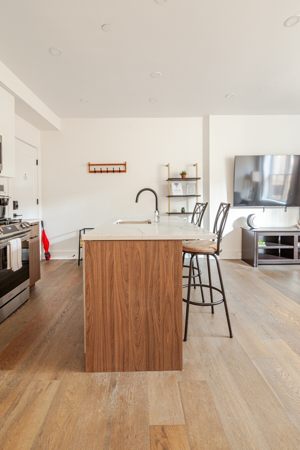 Diese besondere Unterkunft hat einen ganz eigenen modernen Stil. Sie wurde gerade komplett renoviert und alles ist neu, von den Böden über die Geräte bis hin zum Fernseher. In einer ruhigen Straße, nur 5 Gehminuten von der U-Bahn und 2 Gehminuten vom Bus in die Innenstadt entfernt. Gehe zu Supermärkten, Restaurants, Deli, Bäckerei, Apotheke und Geschäften. 3 Minuten zu Fuß zu einem Nationalwald mit deinem pelzigen Freund! Parkplätze abseits der Straße und Ladestation für Elektrofahrzeuge. Viel Platz im Schrank und Stauraum. Waschmaschine und Trockner. Deine Oase in der Stadt erwartet dich.