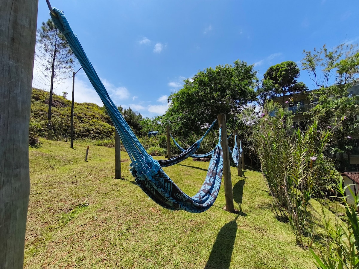 Komfortable und gut ausgestattete Suite für Paare auf einem gemeinsam genutzten Grundstück. Es verfügt über ein Doppelbett, TV mit Chromecast, Ventilator, Klimaanlage, Kleiderschrank, Bettwäsche/Handtücher, Liegestühle, Kühlbox und Sonnenschirm. Es hat eine Veranda mit rustikaler Küche. Auf dem Grundstück gibt es eine Dusche, eine Terrasse, eine Waschküche, einen Garten und einen Gemeinschaftsraum für Luau. Wir sind 800 m vom Strand Lagoinha und 300 m von den Ruinen und Wasserfällen entfernt. Es gibt Restaurants, Eisdielen und Supermärkte in der Nähe.