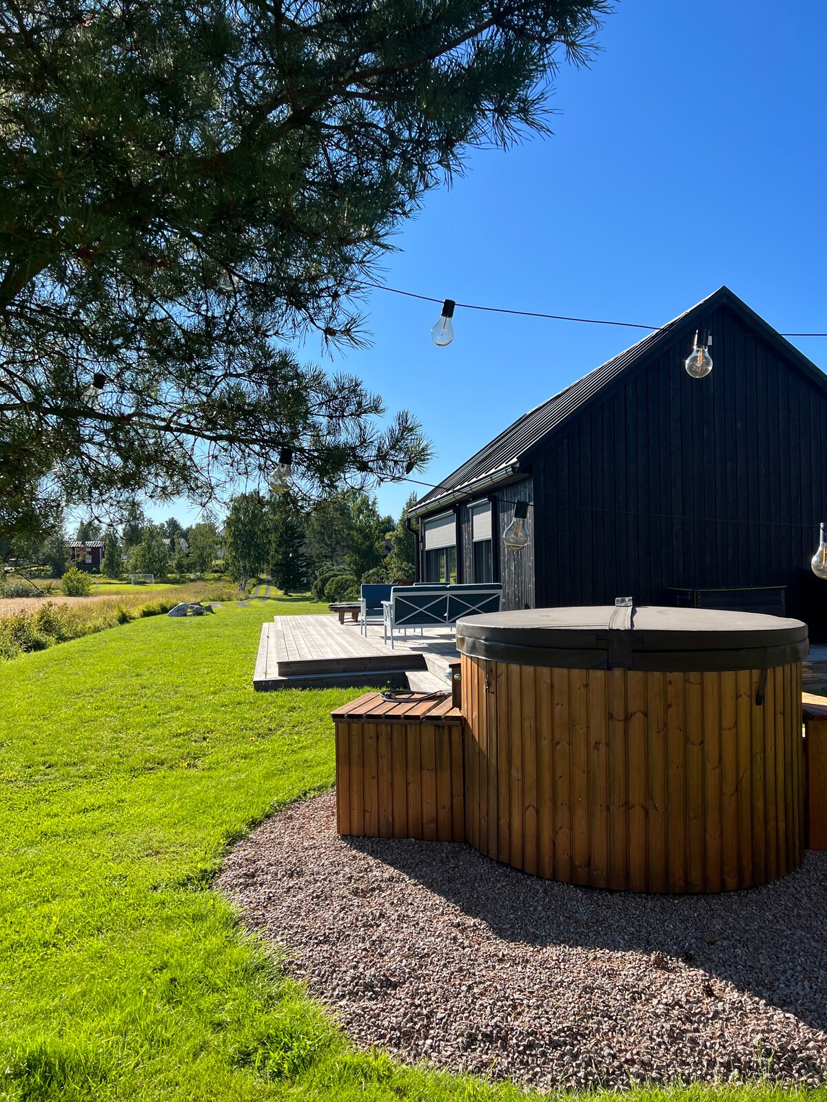 Bergö ist eine Insel in der Gemeinde Malax in Westfinnisch. Sie erreichen die Insel mit der Fähre, die Fahrt dauert ca. 8 Minuten. Hier wohnen Sie bequem, nur einen Steinwurf vom Strand, Bootshaus, Kiosk und Campingplatz entfernt. Wir haben einen schönen Wanderweg auf Bergö. Die Wohnung befindet sich in einem separaten Gebäude, auf unserem Hof Havsglimt. Es gibt Platz für ca. 4-5 Personen. Die Wohnung verfügt über eine Schlafnische, ein Badezimmer, eine offene Küche in Kombination mit einem Wohnzimmer, einem Badezimmer und einem Schlafloft. Bettwäsche und Handtücher sind inklusive. Auf dem Hof gibt es Hühner, in der Nähe weiden Schafe. Auf Bergö gibt es auch einen Laden.