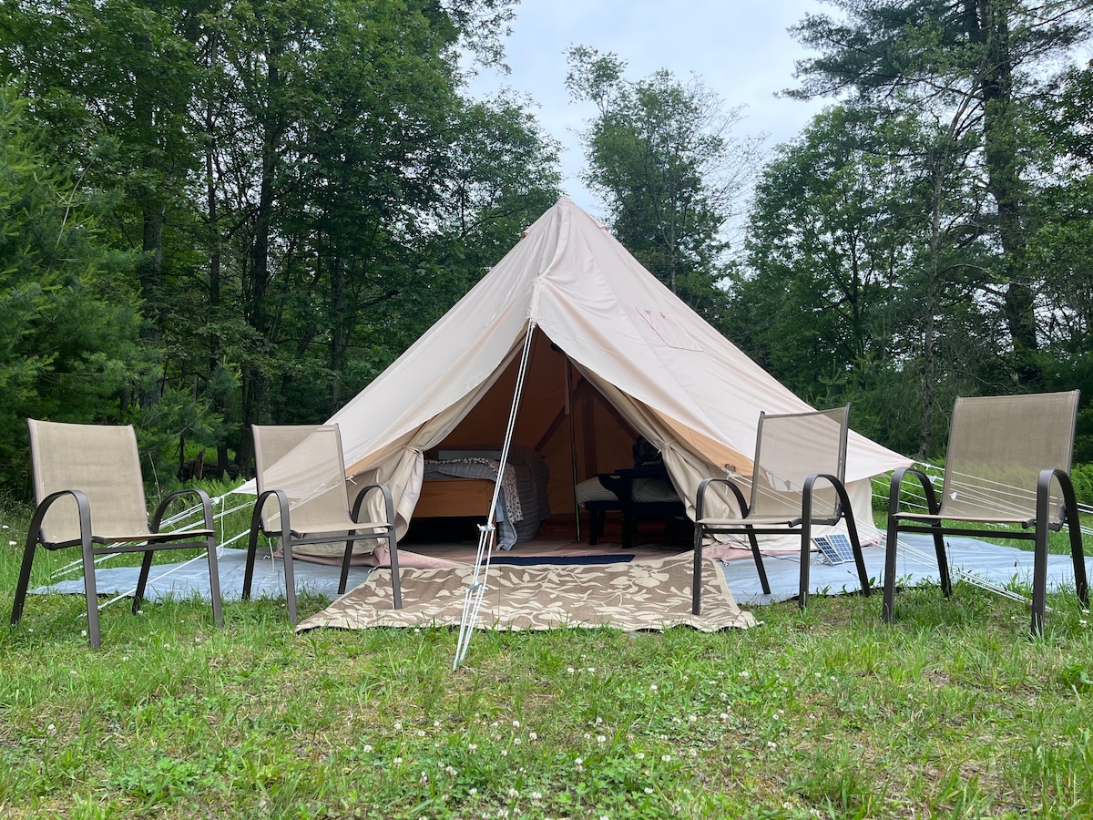 Sehr privates Glamping-Zelt in begehrtem Kerhonkson. Genieße den Klang eines plätschernden Baches. Gehe in deinem eigenen privaten Teich schwimmen. Wandere auf einem 36 Hektar großen unberührten alten Wald. Genieße ein Abendessen in einer Vielzahl von lokalen Veranstaltungsorten, Arrowood, Mill und Main und mehr. Besuche lokale Städte wie Woodstock, New Paltz, Ellenville und Phonecia. Dein Zelt ist mit zwei Queensize-Betten für bis zu 4 Personen ausgestattet. Eine Propanheizung ist inbegriffen, um dich warm zu halten. Küchenutensilien, Gasgrill und Feuerstelle sind inbegriffen.