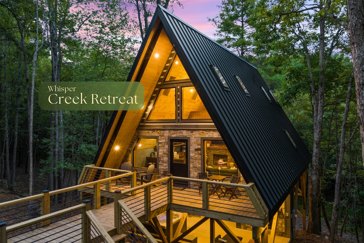 Reece Retreats lädt dich ein, nach Whisper Creek Retreat zu entkommen, einem luxuriösen A-Rahmen-Baumhaus, das 2025 in der Nähe von Blue Ridge, GA, gebaut wurde. Diese Hütte mit 2 Schlafzimmern und 2 Bädern liegt auf einem privaten Grundstück am Bach und bietet Platz für 6 Personen. Sie verfügt über einen abgeschirmten Balkon, eine Sauna, einen Whirlpool, eine Feuerstelle, eine TV-Lounge im Freien und einen Spielplatz. Genieße bodentiefe Fenster, eine voll ausgestattete Küche, schnelles WLAN und absolute Ruhe.