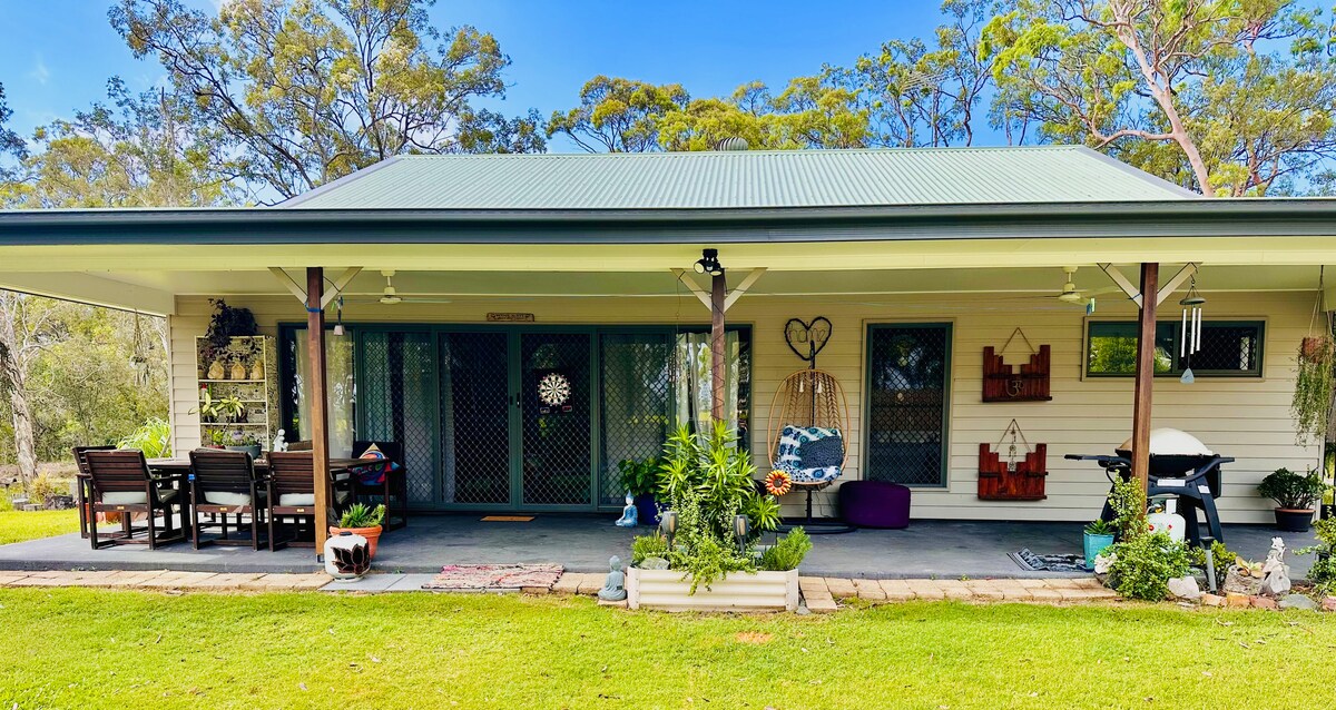 Entspanne dich einfach und genieße den schönen Blick auf den Fluss Mary River und Zuckerrohrfelder auf der vorderen Veranda. Fühle dich einfach so frei und entspanne dich vollständig, während du Boote vorbeifahren siehst und fantastische schöne Sonnenuntergänge genießt. Ideal für Flitterwochen und Familien. Genieße die schönen 7 Hektar großen Gärten und Obstbäume mit Zugang zum Fluss und Dämmen mit Vogelwelt. Genieße ein Barbecue mit Sitzbereich im Freien oder sitze an der großen Feuerstelle. Eine ruhige Lage zwischen Maryborough und Hervey Bay mit Blick auf den ruhigen Fluss.