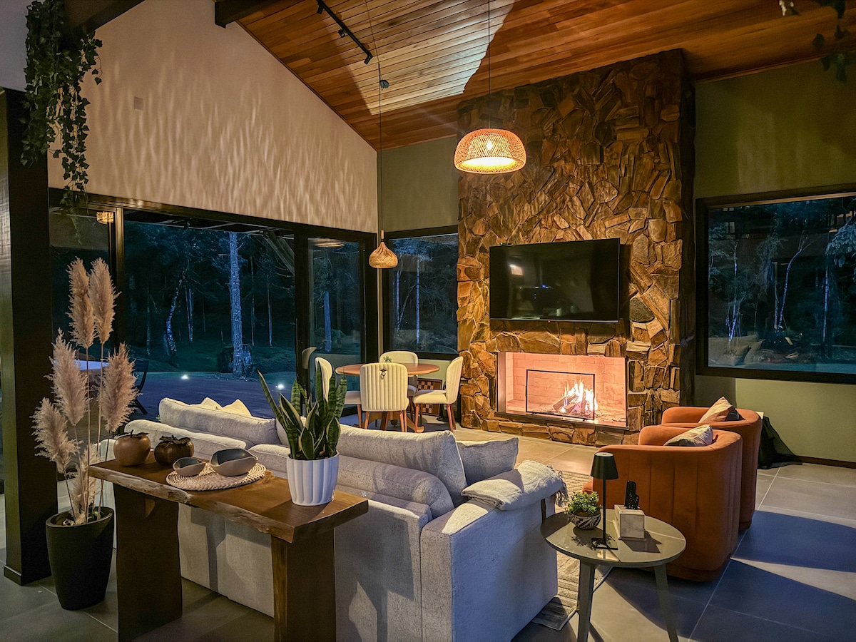 Unsere Hütte ist ideal für Menschen, die einen ruhigen, gemütlichen und komfortablen Aufenthalt suchen. Die integrierte Umgebung bietet Raffinesse, Funktionalität und Verbindung zur Natur. Beim Betreten werden Sie von einer gemütlichen Atmosphäre mit sorgfältig geplanten Details empfangen. Angesichts der für die Region charakteristischen Kälte sorgt die Fußbodenheizung der Hütte für thermischen Komfort im gesamten Ambiente. Die großen Glasfenster bieten einen atemberaubenden Blick auf die umliegende Natur und durchfluten den Raum mit natürlichem Licht.