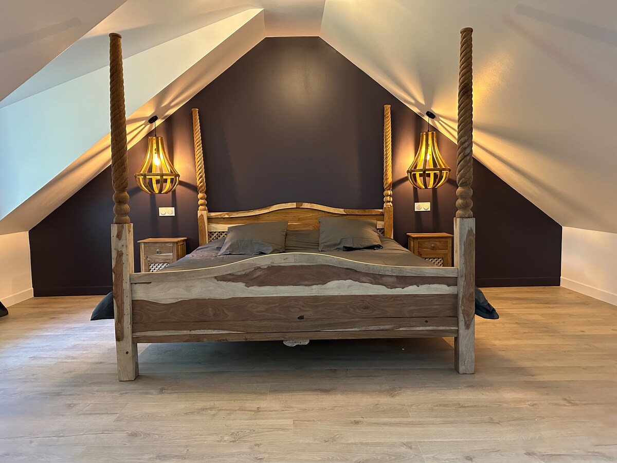 Entdecken Sie diese atypische und gemütliche Unterkunft, eine alte Scheune, die mit Sorgfalt restauriert wurde. Genießen Sie eine einzigartige Dekoration, einschließlich antiker Möbel und Barbotine, die eine warme und einladende Atmosphäre schafft. Dieser ruhige Rückzugsort bietet einen geräumigen Raum mit einer schönen Deckenhöhe, außergewöhnlichem Komfort und einer eleganten Badewanne mit Löwenfüßen. Erleben Sie ein einzigartiges romantisches Erlebnis in einer ruhigen und charmanten Umgebung, perfekt, um wieder zueinander zu finden und sich zu entspannen