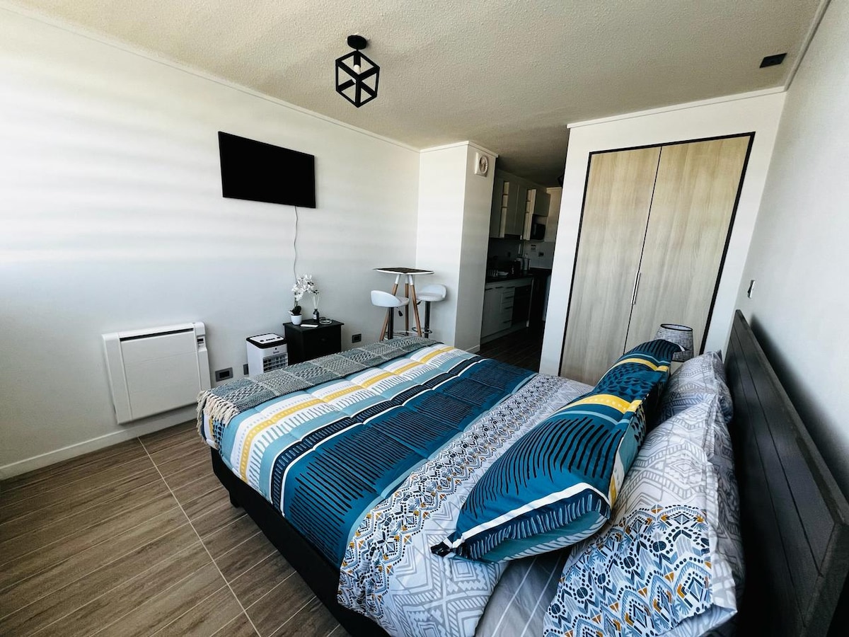 Brandneues Studio-Apartment für zwei Personen in Isla Teja -Valdivia. Private Eigentumswohnung mit 24-Stunden-Überwachung. Es besteht aus Wäscherei, CoWork-Räumen, Fahrradständern. Das Hotel liegt in der Nähe von Parks, verbleibenden und herausragendsten Bars der Stadt, nur wenige Schritte von Costanera, Parque Saval, Casino Dreams und Feria Fluvial entfernt. Sie besteht aus voll ausgestatteter Küche, Granitküche mit Backofen, Dunstabzugshaube und Cerankochfeld. Kostenloser Privatparkplatz inklusive.
