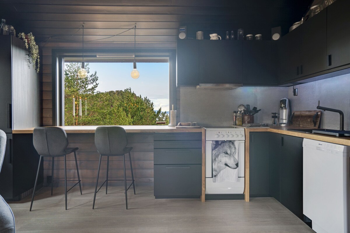 Et unikt, idyllisk, lite trehus i moderne stil. Fargepaletten i denne hytta er i varme og omsluttende toner. Solide skinnmøbler og gamle interiørdetaljer skaper en koselig rustikk effekt. Svarte tak og vinduer rammer inn utsikten og naturens farger utenfor. Her faller lyset inn fra det store vinduet over den høye kjøkkenbenken og du kan sitte og nyte utsikten over skogen og fjorden.