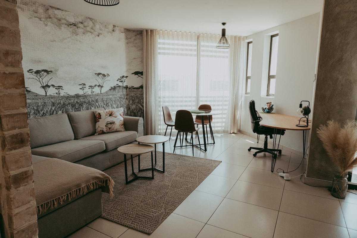 Stilvolle Stadtwohnung für den modernen Reisenden. Du bist im Herzen von Windhoek, aber sehr privat, mit einem atemberaubenden Blick auf den Sonnenuntergang aus dem 4. Stock. Schlafe in einem luxuriös ausgestatteten Queensize-Bett in einem Raum mit Aussicht. Genieße den Sonnenuntergang auf deinem privaten Balkon. Sieh dir kostenloses Netflix oder eines deiner Lieblingsprogramme auf einem 75-Zoll-Flachbildschirm an. Tauche ein in den Gemeinschafts-Mini-Pool oder grille im Gemeinschafts-Braai-Bereich. Sicherer Innenparkplatz. Gutes WLAN. Nur 1 direkter Nachbar. Sicher und ruhig.