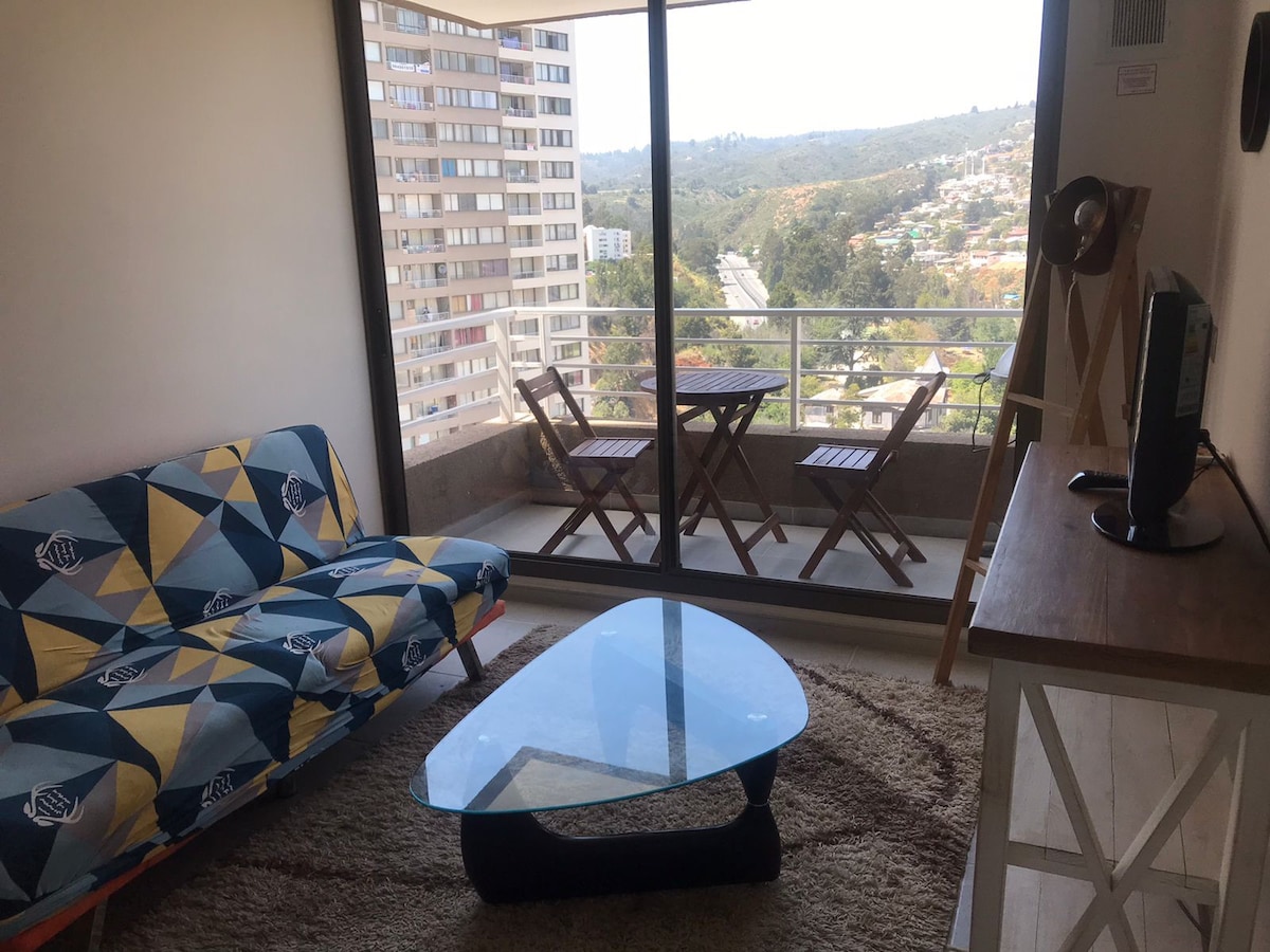 Departamento nuevo, moderno, equipado, de 2 ambientes y un balcón de 6 mts. lineales que mira los cerros de Valparaíso y el Océano Pacífico. Además cuenta con 2 piscinas hermosas de temporada y servicio de lavandería. Excelente ubicación y conectividad en transporte público electrico (Patrimonial) y cercano solo a 6 cuadras del terminal de buses.