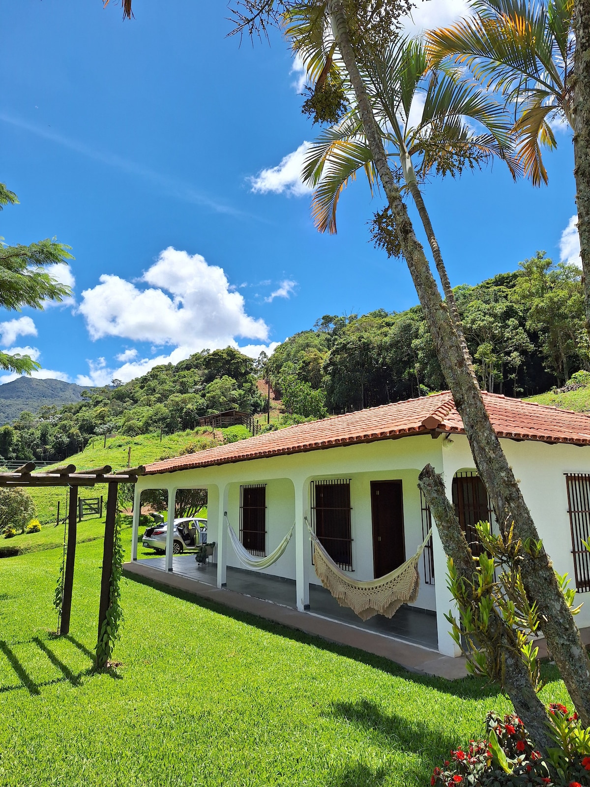 Riesiges Haus, in der Nähe des Stadtzentrums (1 km) und der Zufahrt zu den Autobahnen zu den Stränden. Frische und luftige Immobilie. Schöne Aussicht und Rauschen der Wasserfälle! Das Haus verfügt über 4 große Schlafzimmer (2 mit Doppelbetten, 1 Suite mit Einzelbett und 1 mit Matratze). Es gibt eine große Veranda, auf der Sie eine Hängematte zum Schlafen aufstellen können. Es ist möglich, den ganzen Ort oder nur Zimmer zu buchen. KEINE GARAGE. 30 Minuten vom Strand entfernt. 380 km von Rio Hauptstadt/120 km von Campos (RJ)/130 km von Vitória/100 km von Pico da Bandeira.