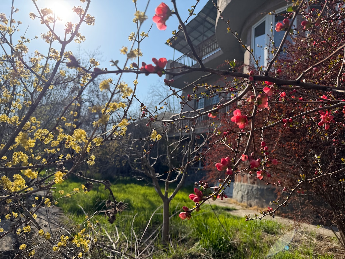Ein großes 2-stöckiges Haus mit Blick auf den Tempel von Garni und das Bergpanorama, umgeben von einem Obstgarten (Äpfel, Birnen, Kirschen, Haselnüsse, etc.). Das Haus ist mit den Werken des armenischen Künstlers Martirosyan dekoriert. Drei Schlafzimmer, Wohnküche, Galerie, zwei Bäder, 4 Balkone. Wir bieten unseren Gästen armenische Küche (Frühstück, Mittag- und Abendessen) und veranstalten einen Meisterkurs im Bemalen von Tellern auf vorbereiteten Schablonen. Es gibt einen Platz zum Grillen.