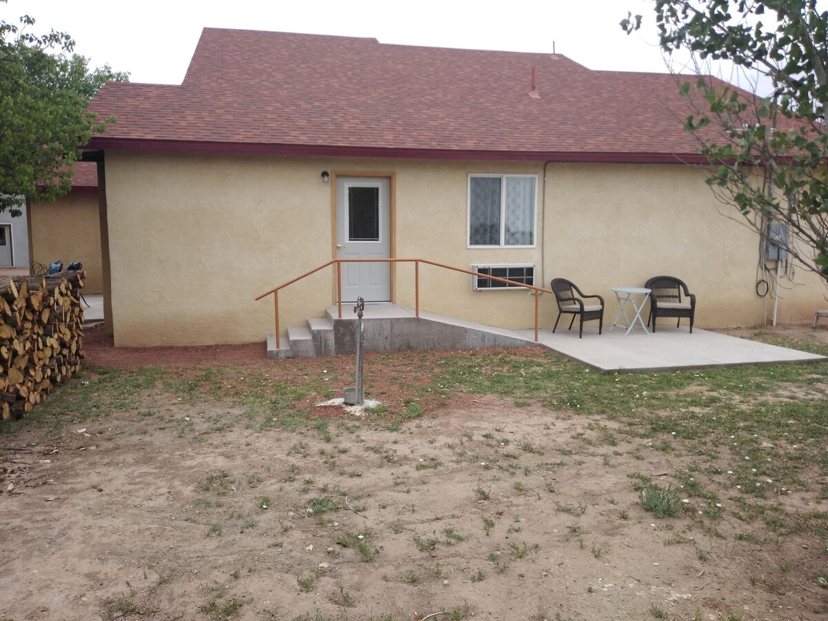 Dieses Studio in ruhiger Lage auf dem Land verfügt über einen privaten Eingang, ausreichend Parkplätze und befindet sich in der Nähe des Rio Grande River. Von Bäumen gesäumte Naturwandergebiete, viele Vögel und in der Nähe von Tierheimen! Auch in der Nähe eines privaten Angelplatzes. Im Herbst hörst du die Kraniche und andere Schneevögel, die im Winter in der Gegend rasten. Die Küche ist mit einem vollen Kühlschrank, einer Mikrowelle, einer elektrischen Pfanne und einem doppelten elektrischen Herd ausgestattet. Das Badezimmer verfügt über eine Badewannen-Dusch-Kombination, Waschbecken und Toilette.