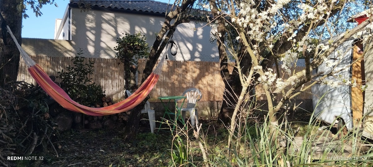 Gemütlicher Familienwagen für 4 Personen mit Markise, Terrasse, Gartentisch, Grill. Das Hotel liegt in einem typischen Weiler Olero Grésillon, in einem von Weinbergen gesäumten Familiengarten, in der Nähe eines Waldes und Radwegen durch die Sümpfe, um zu den großen Stränden von Vert Bois und Grand Village etwa fünfzehn Minuten zu gelangen. Funktionelle Küche und Wohnwagenbad mit Dusche und WC. Parkplätze. Trockentoilette im Freien und Solardusche im Freien.