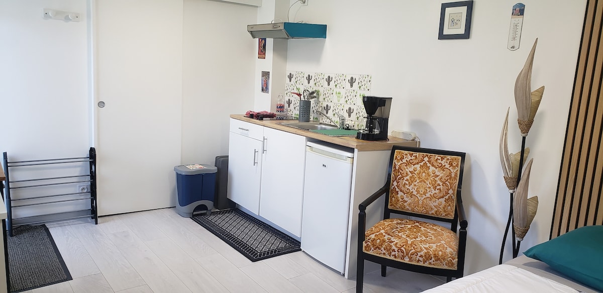 Unabhängiges Studio von 30 m2, 3 Sterne. • Im Erdgeschoss: Einbauküche Wohnzimmer Badezimmer (Waschbecken / Dusche)+ WC. • Schlafzimmer im Zwischengeschoss: Queensize-Bett (160 x 200), Ankleide und Schreibtisch • Kleine private Terrasse • Parkplatz in der Nähe Siehe andere Hinweise für: Wäsche, Bettwäsche, Reinigung und Zustellbett.