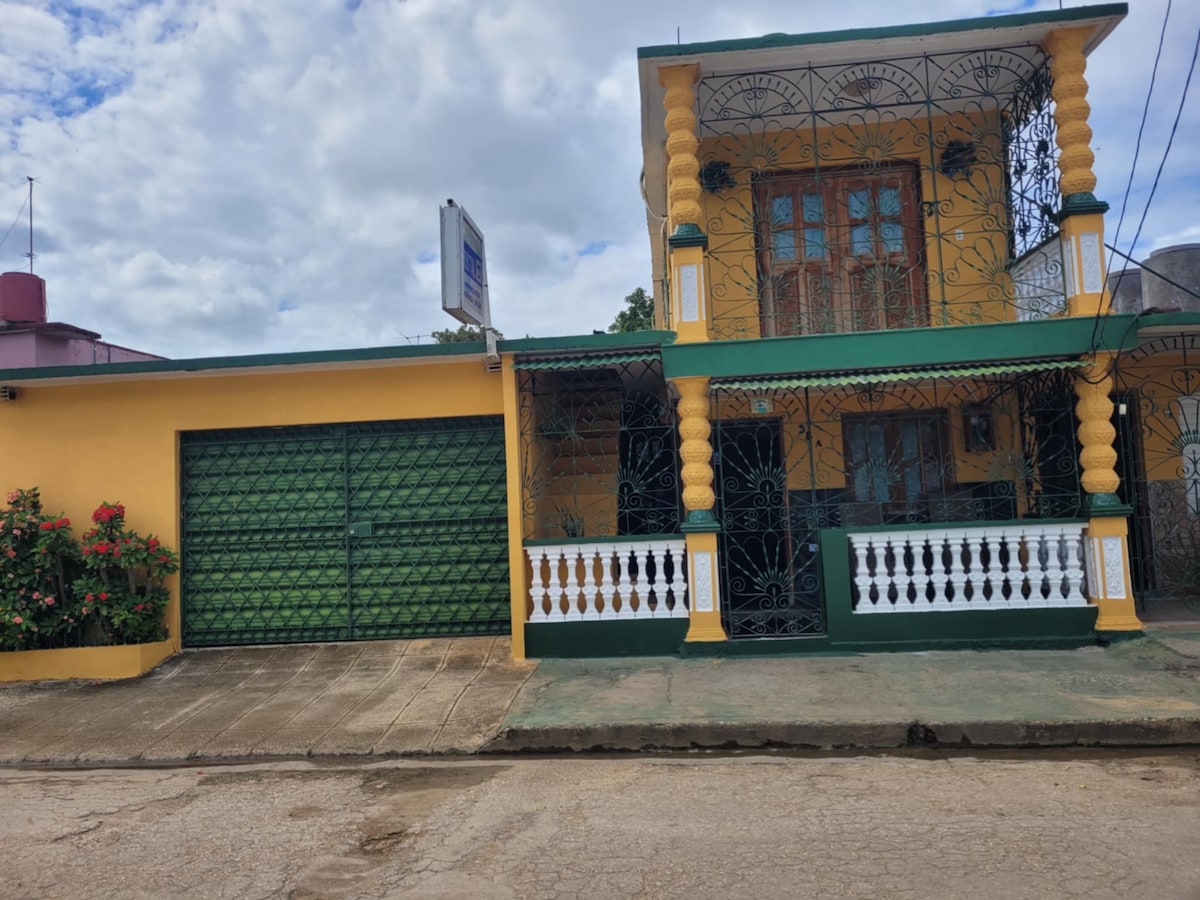 Nuestra casa se encuentra ubicada en una de las calles principales de la ciudad, perteneciente al casco histórico. Fue construida en 1914, conserva su estructura exterior a pesar de haber sido remodelada y todo el interior es moderno, contamos con cuatro habitaciones en la primera planta.Además una amplia terraza donde puede degustar un desayuno, una cena tradicional o disfrutar de buena música cubana y más arriba una azotea que permite visualizar parte de la zona urbana de la ciudad.