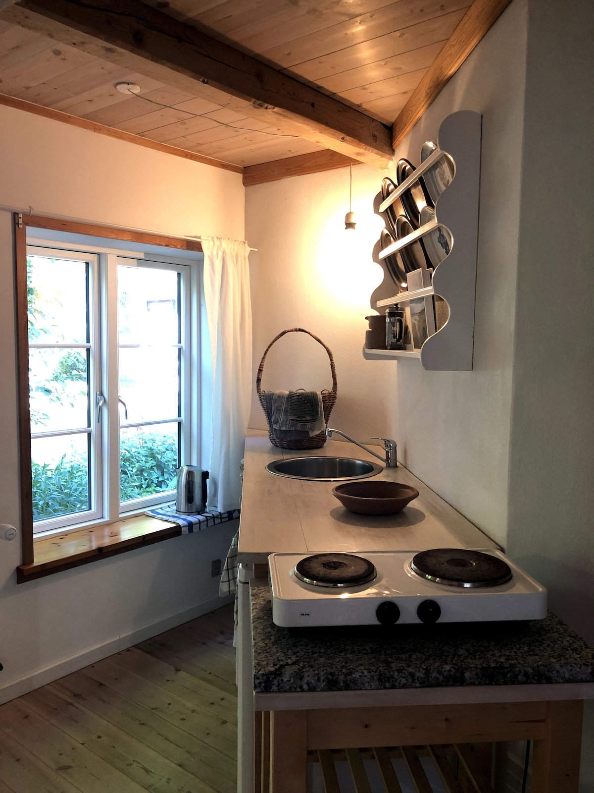 Gemütliches Nebengebäude, wunderschön am See Ollerup gelegen. Der Anbau wurde 2021 mit rohen Backsteinwänden und Holzdecken errichtet, was eine ganz besondere Atmosphäre verleiht. Im Wohnzimmer befindet sich ein neues 140 x 200 cm großes Bett, sowie ein Dachboden. Es gibt einen eigenen Eingang, eine große Holzterrasse und Zugang zum See Ollerup. Es ist möglich, ein Ruderboot zu leihen. Küche: Es gibt zwei Herdplatten, Kühlschrank mit kleinem Gefrierfach, Wasserkocher, etc