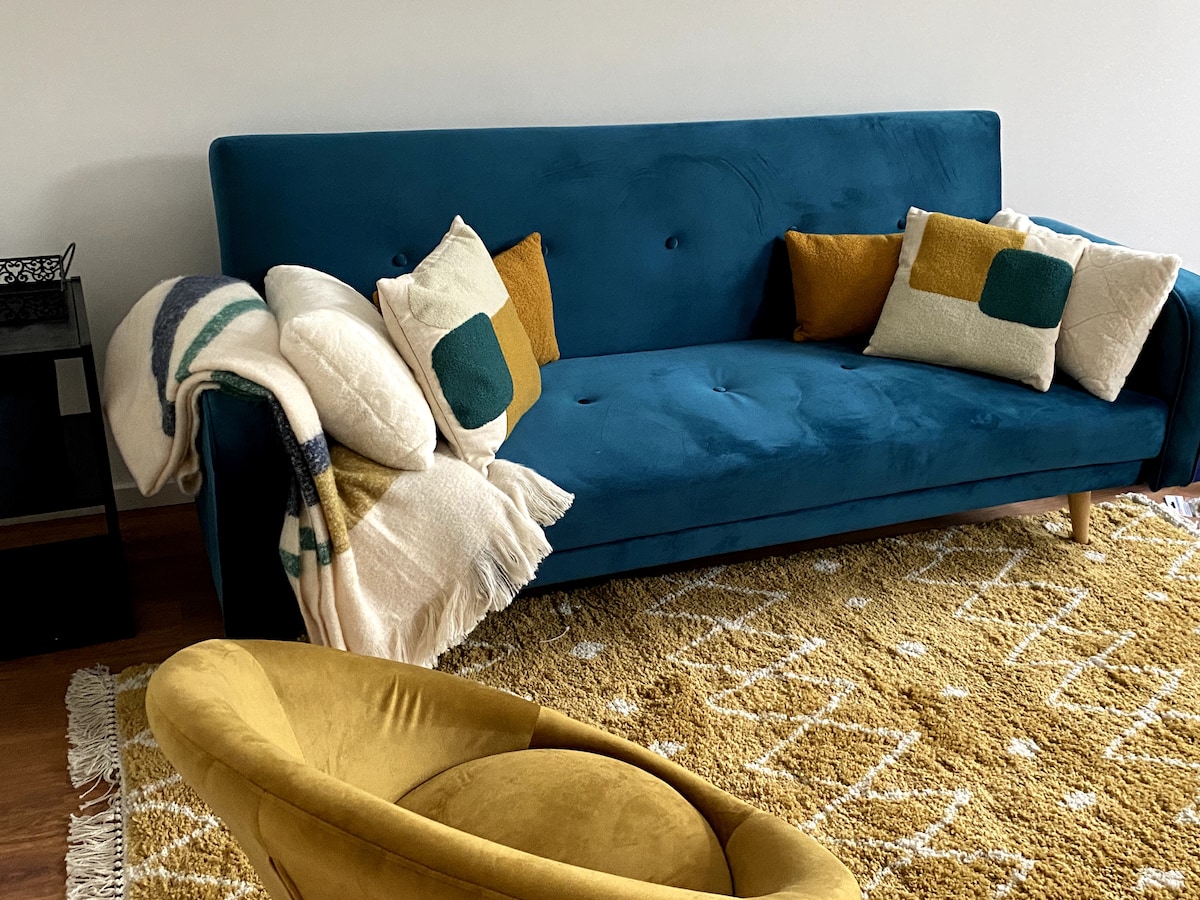 Entdecke eine Oase des Komforts in dieser sorgfältig eingerichteten Wohnung. Die Wohnung verfügt über eine minimalistische Innendesign-Ästhetik, beruhigende Grautöne mit subtilen Blautönen, elegante Oberflächen und einen offenen Wohn-/Schlafbereich. Ein Stück Heimat für ein paar Wochen oder Monate! Schnelles WLAN (50 mbit), heißes Nespresso, TV vor einem bequemen und hohen Boxspringbett (1,60x2m)!