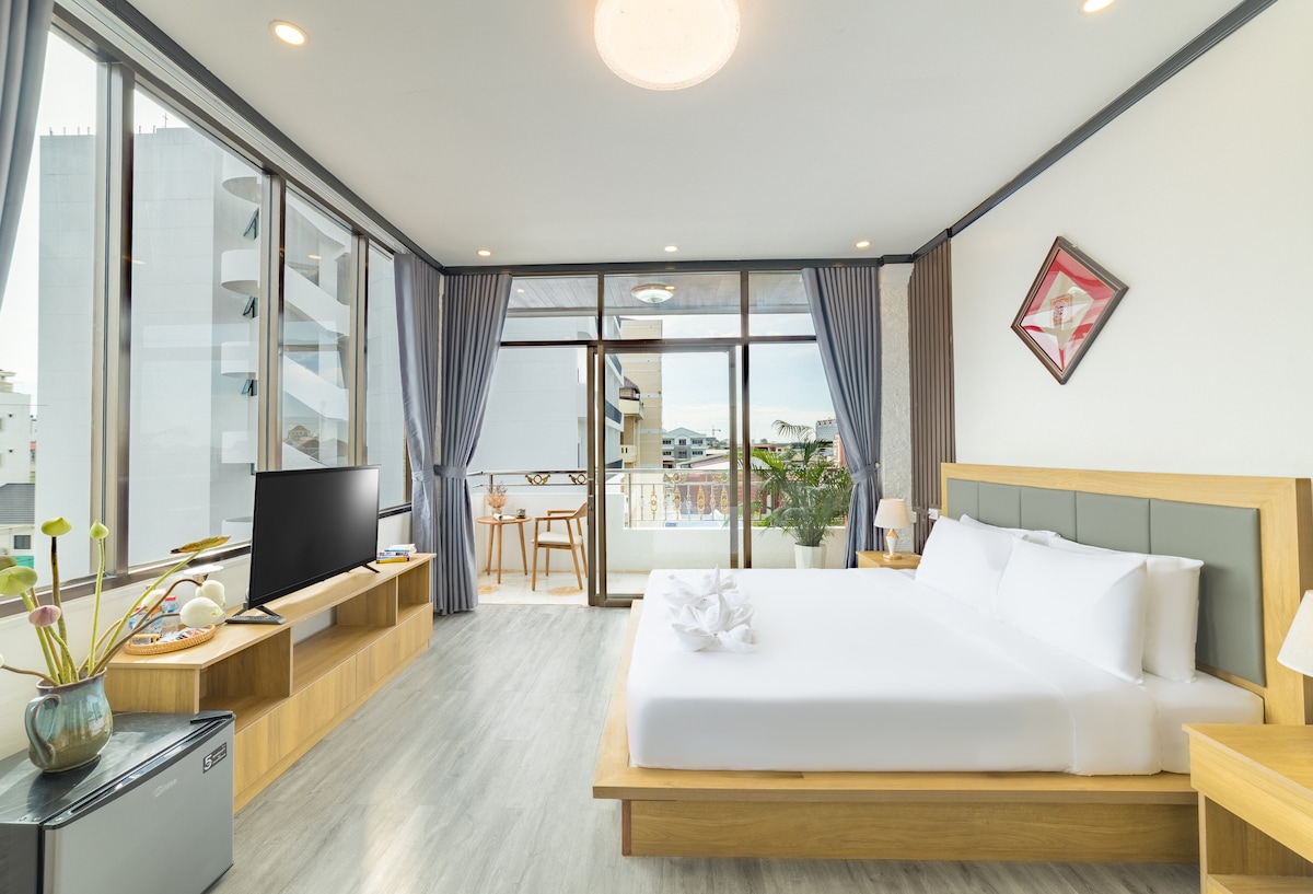 Genieße ein geräumiges 30 m² großes Zimmer mit einem großen privaten Balkon und Panoramablick auf die Stadt Vientiane. Das Zimmer ist komplett mit Klimaanlage, heißer Dusche, TV, Kühlschrank und Kleiderschrank ausgestattet - alles, was du für einen angenehmen Aufenthalt benötigst. Hell, sauber und ruhig, ist es perfekt zum Entspannen nach einem Tag in der Stadt. Kostenlose Parkplätze stehen ebenfalls vor Ort zur Verfügung.